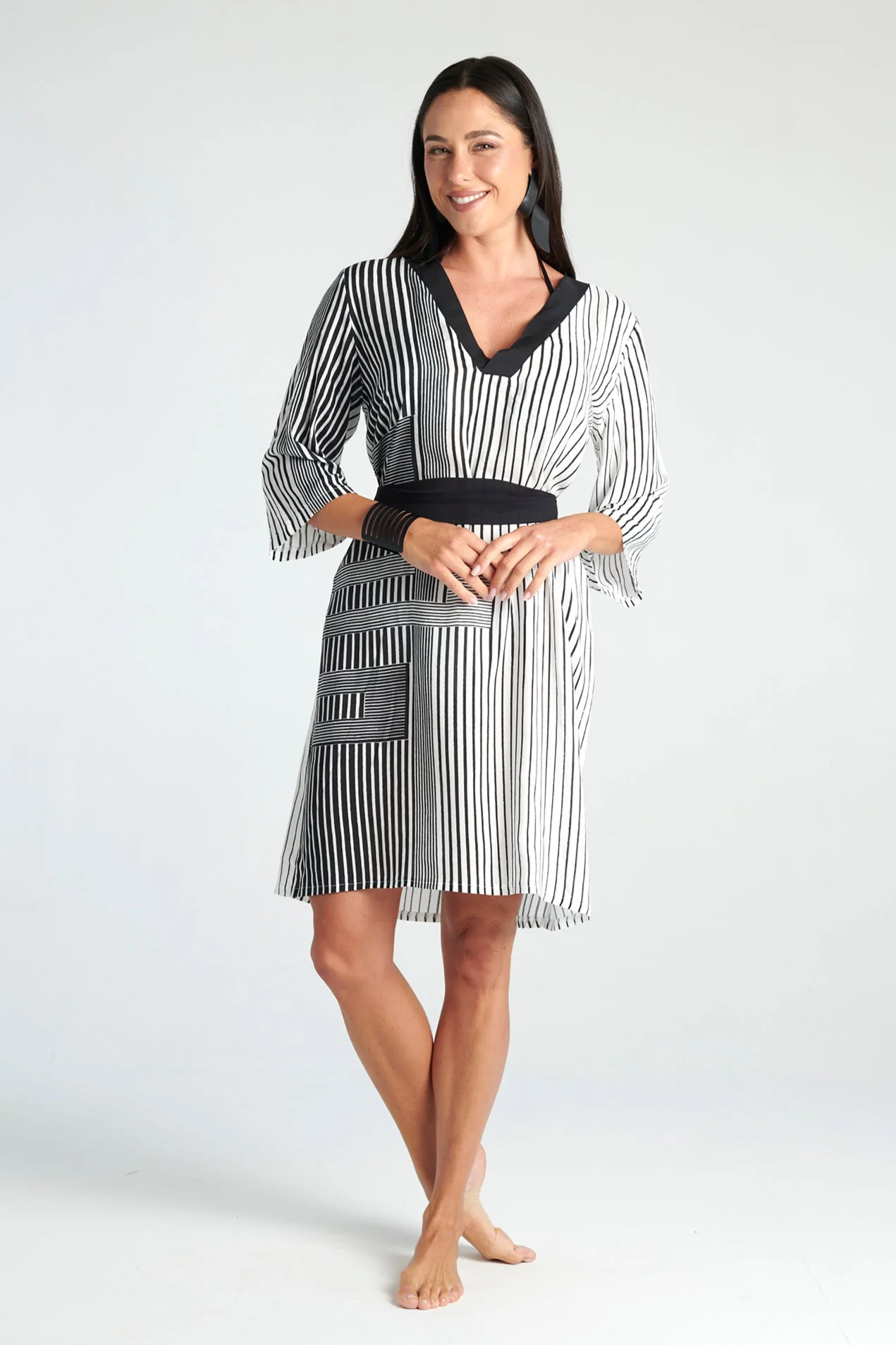 Abitino in viscosa stampa linee. Fresco, estivo e adattto alle tue vacanze al mare. Manica a 3/4, lunghezza ginocchio e scollo a punta realizzato in viscosa tinta unita nero. Il cinturone permette al meglio di valorizzare il tuo punto vita. 100% Viscosa