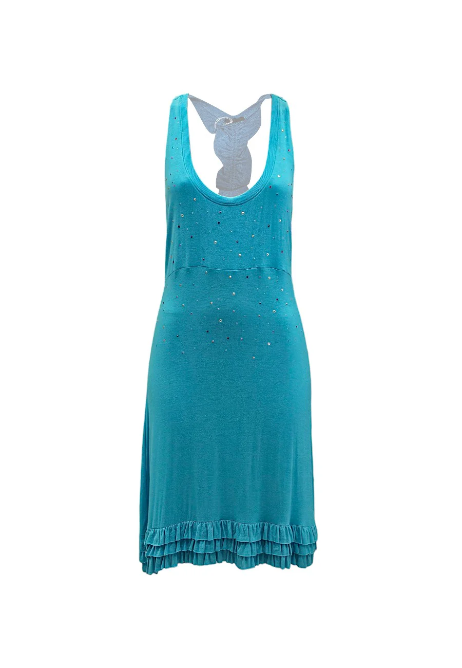 Fresco abitino lungo Baci rubati con applicazioni strass su fondo azzurro. Schiena scoperta con inserto drappeggiato regolabile e pendenti. Fondo a balze 92% viscosa 8% licra