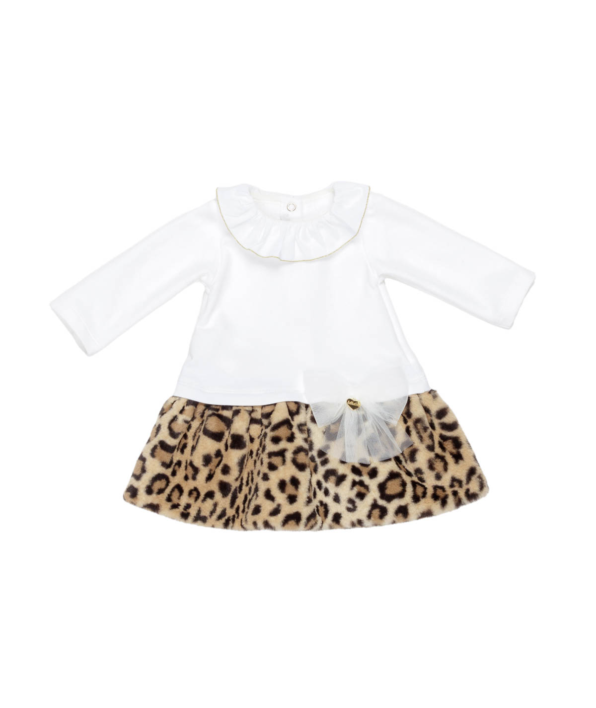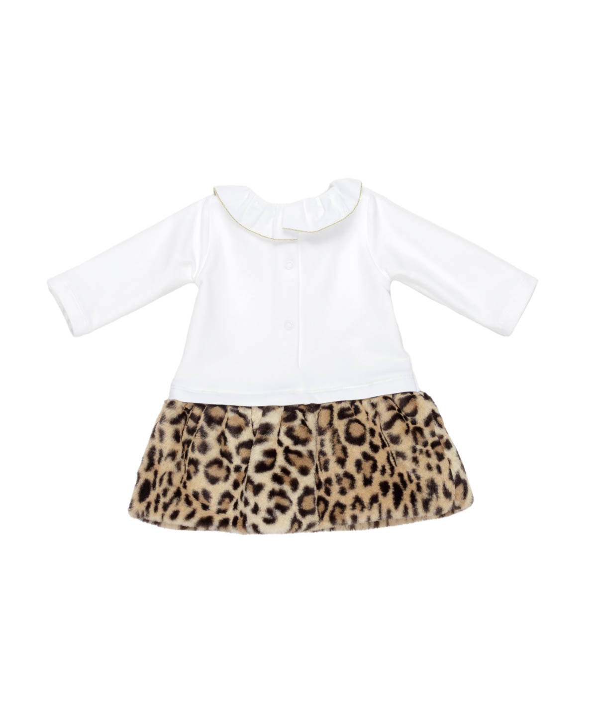 Abitino per neonata le Bebè in caldo cotone fondo bianco con balza in pelliccetta maculata. Collo con balze e fiocco in tulle in vita.