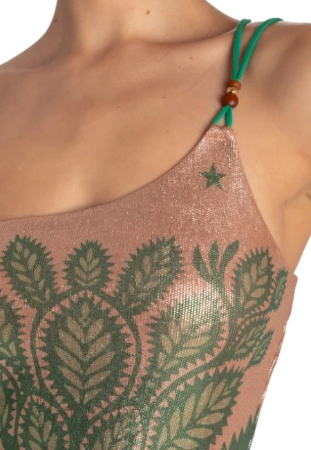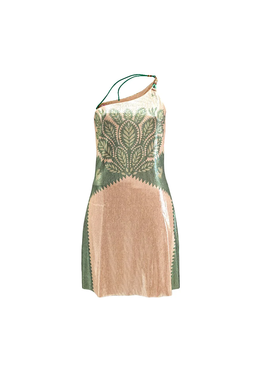 Seducente abito monospalla in lycra bielastica stampa Beautiful Tree che esalta la shilouette. La laminatura oro conferisce luminosità ed eleganza a al capo. Piccole perle impreziosiscono i laccetti del monospalla. Indossato con un saldalo basso mantiene la sua eleganza, con un tacco per osare un look più provocante.