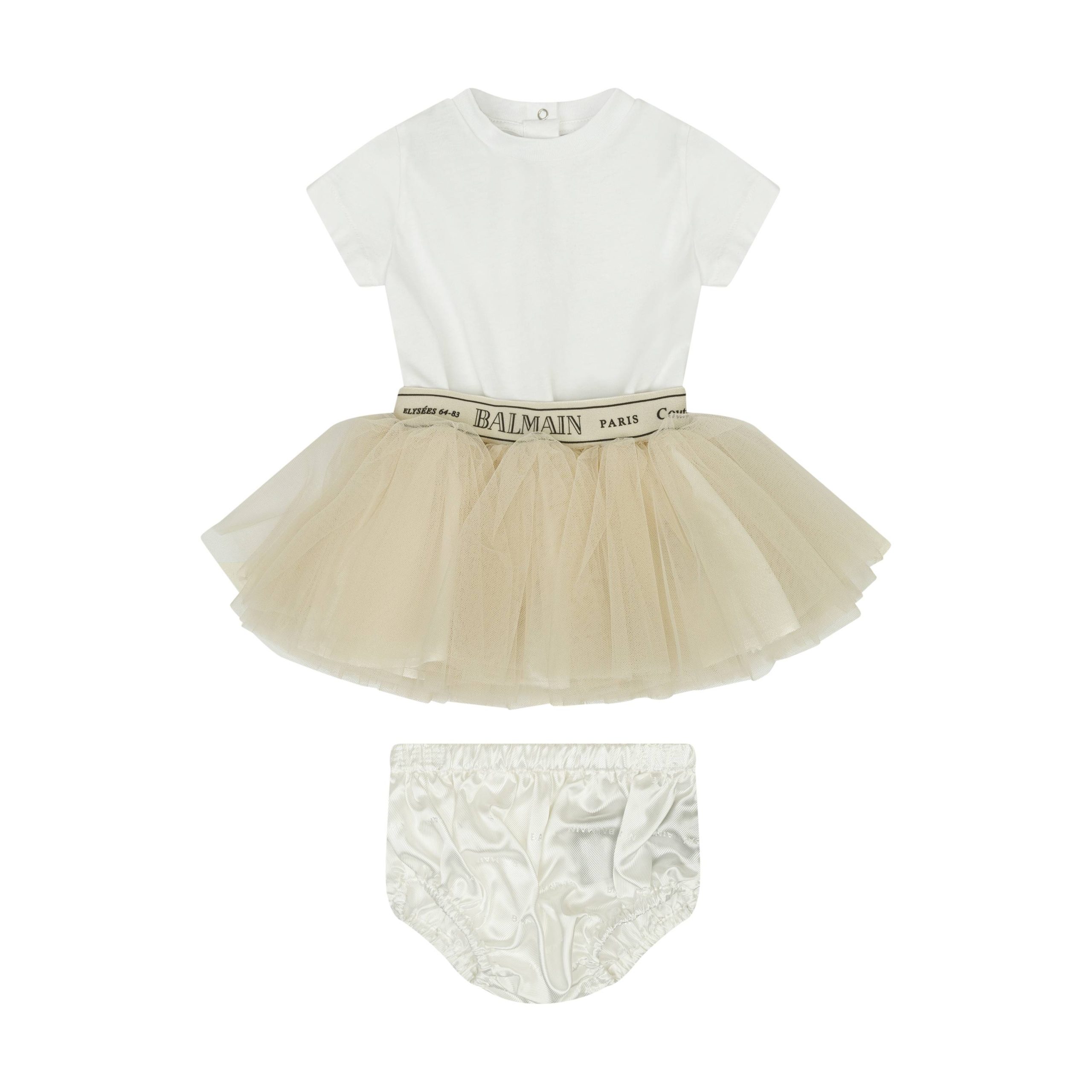 Abito per neonata Balmain Kids, il prodotto presenta un color bianco, maniche corte, vita elasticizzata, fascia con logo, gonna in tulle a strati e pantaloncini abbinati, realizzato in poliammide 100%.