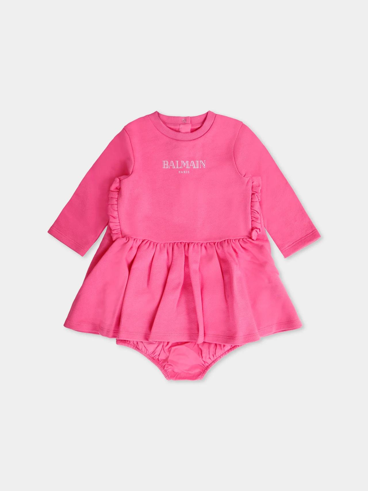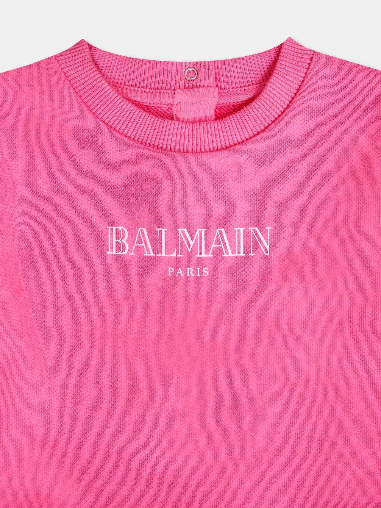 Mini Abito fuxia, con maniche lunghe, girocollo e orli a costine. ร decorato con logo Balmain centrale e coulotte integrata.