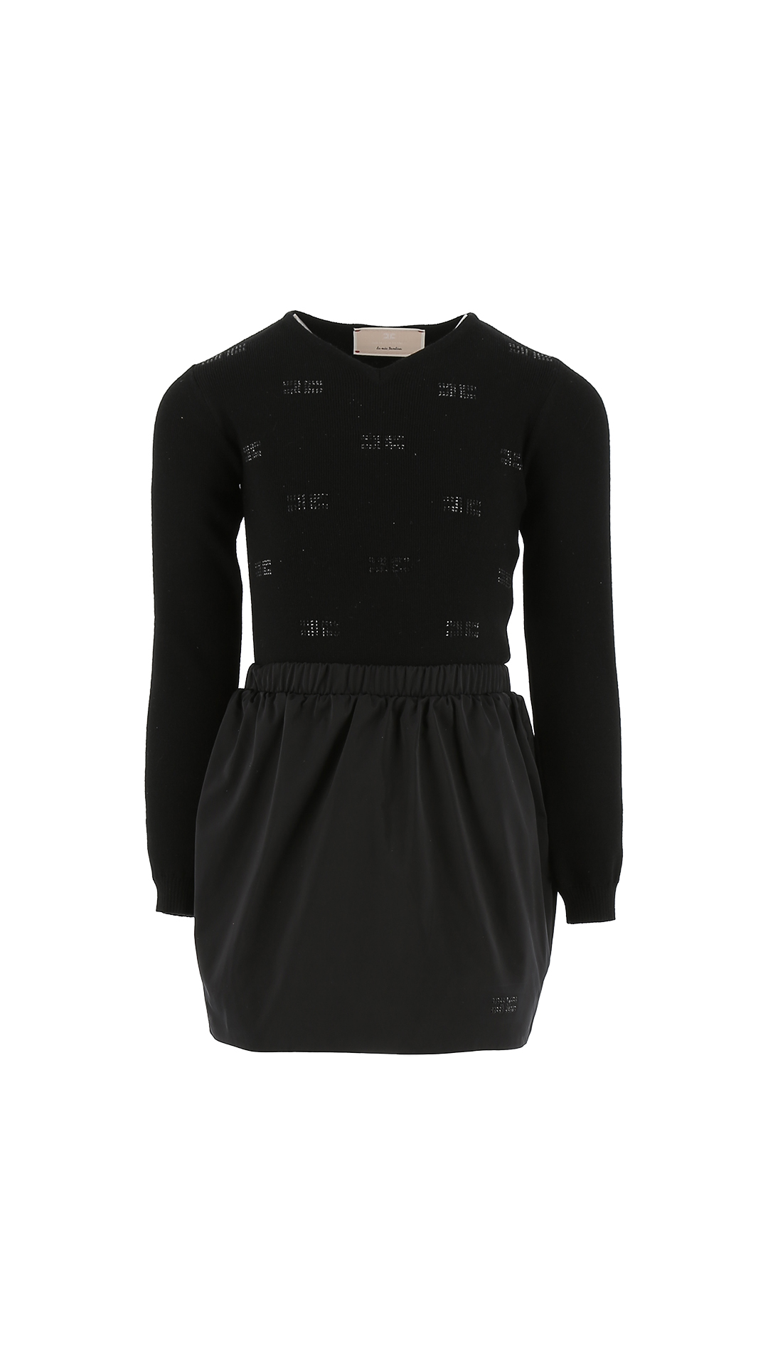 Elegante abito nero di Elisabetta Franchi per bambine e ragazze L'abito presenta maniche lunghe e un taglio medio, perfetto sia per le occasioni speciali che per i momenti eleganti. La parte superiore dell'abito รจ decorata con loghi EF scintillanti, che aggiungono un tocco lussuoso e giocoso, realizzata in un tessuto diverso da quello della gonna, creando un bellissimo contrasto. La vestibilitร รจ comoda e femminile, con una sottile cintura in vita. La gonna scorre elegantemente intorno al corpo. Realizzato con materiali di alta qualitร per una sensazione di stile e comfort.