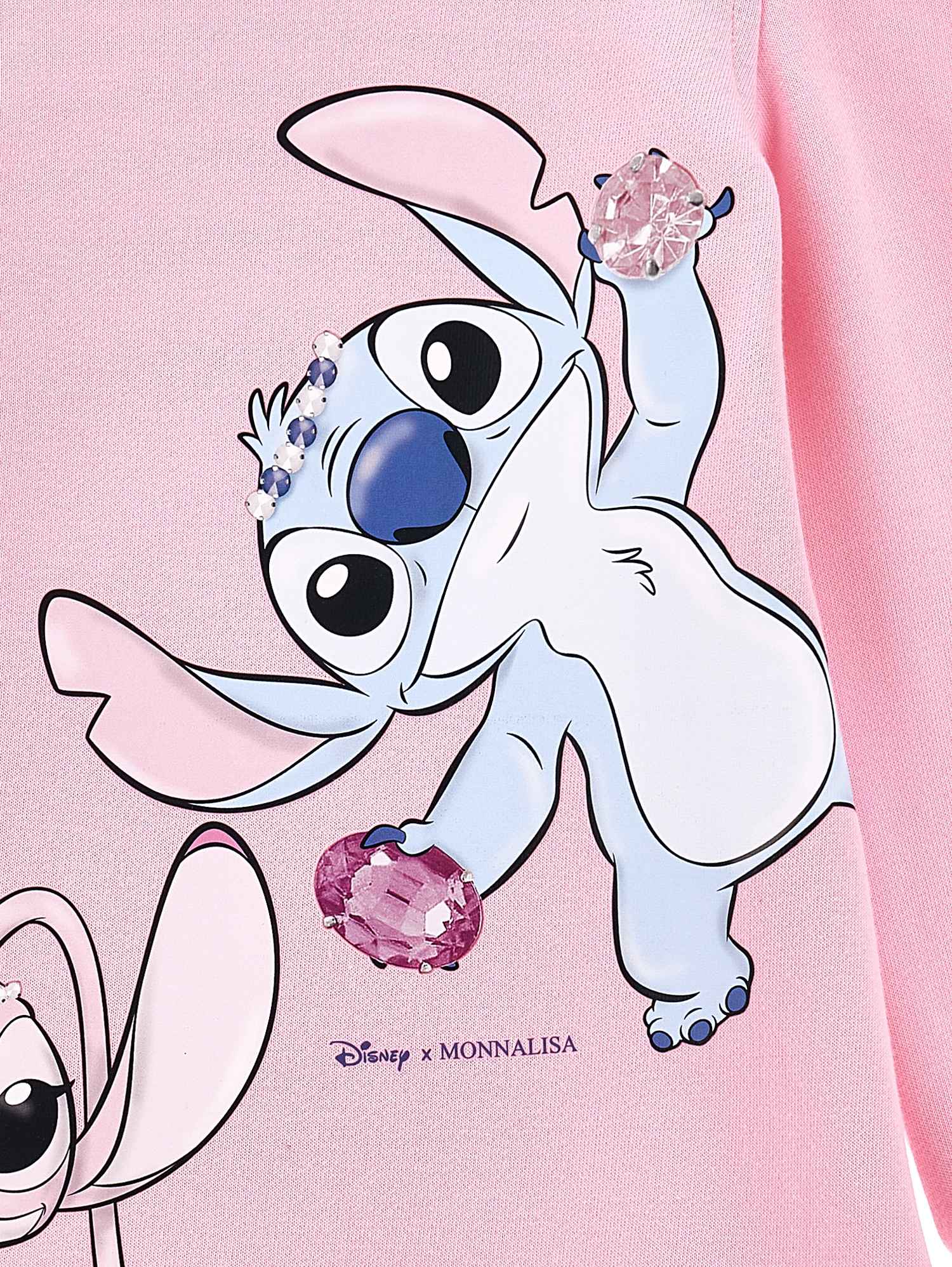 Abito per bambina Disney x Monnalisa rosa con stampa Stitch. Il prodotto presenta un girocollo, maniche lunghe con spalla arricciata, orlo e polsini a coste.