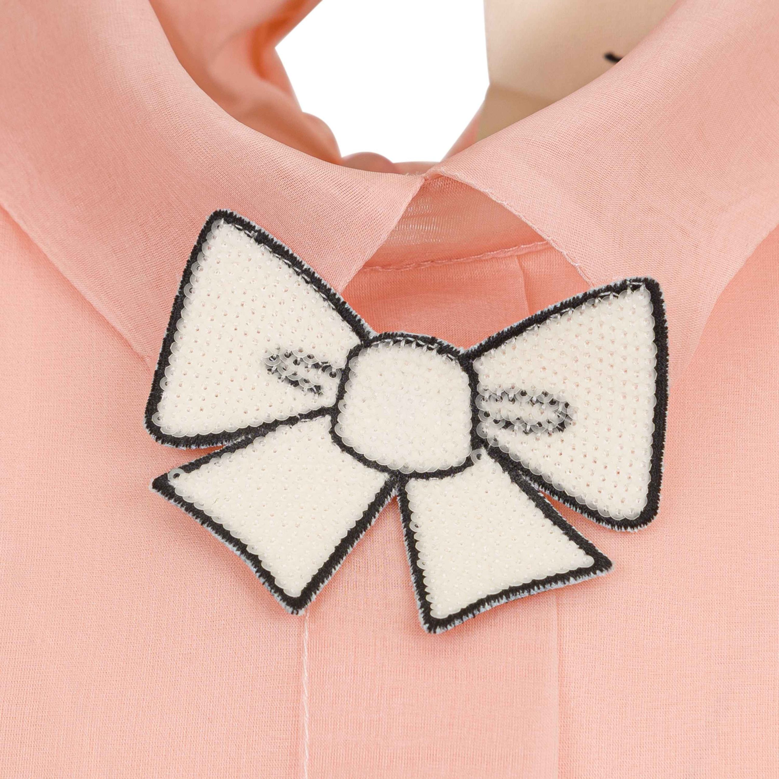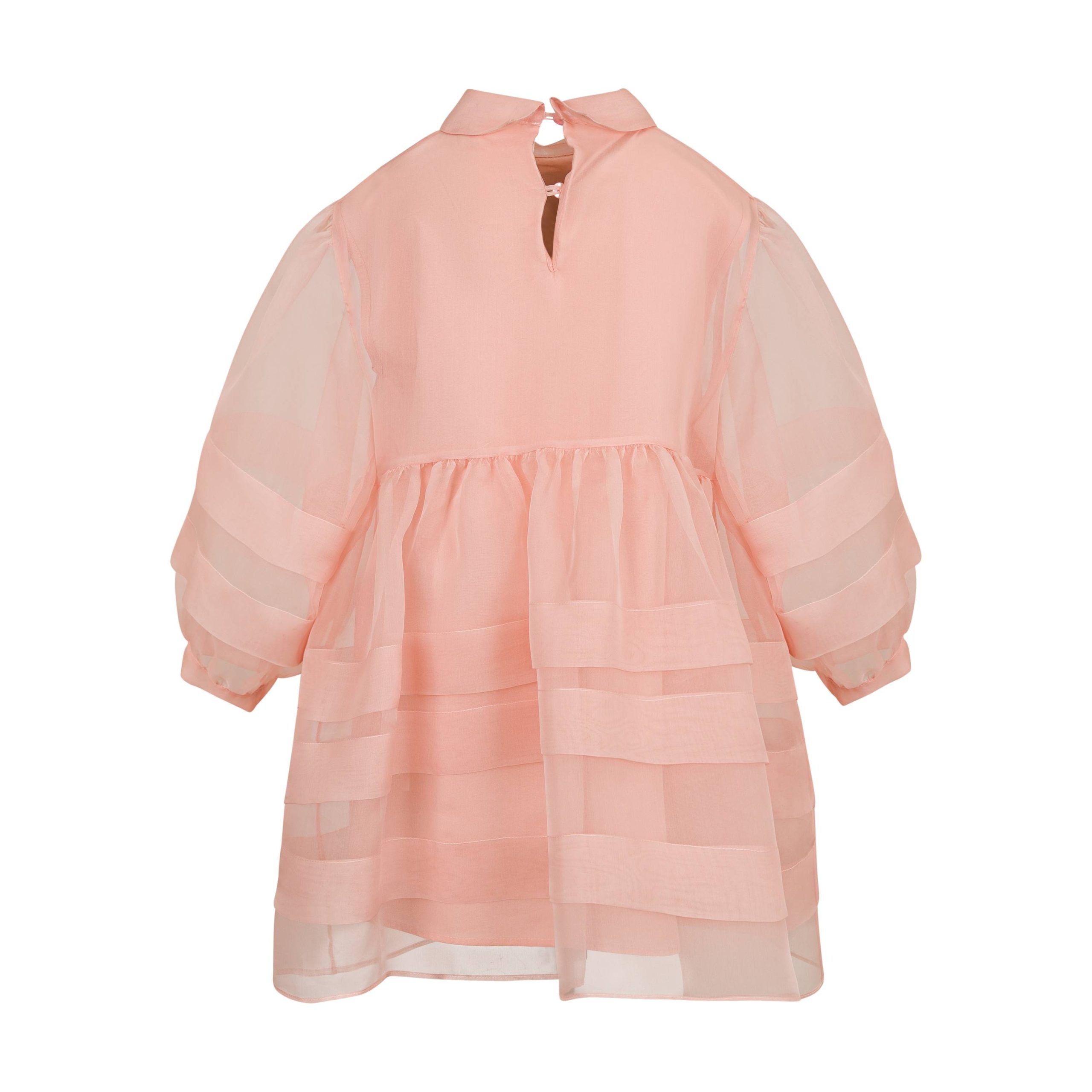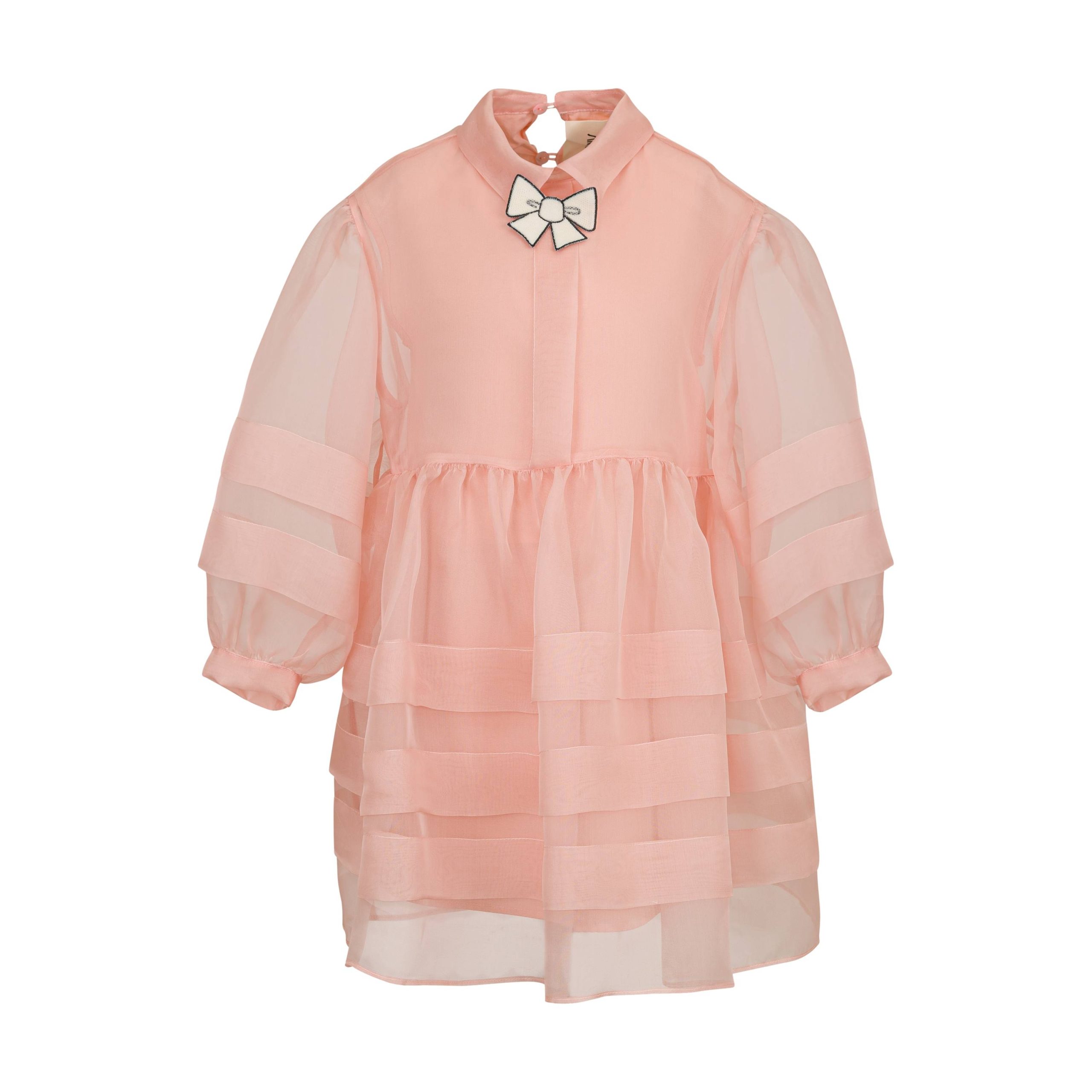 Abito Simonetta per bambine in organza rosa con balze, applicazione fiocco sotto al colletto, chiusura con bottoni sul retro. Composizione 100% seta.