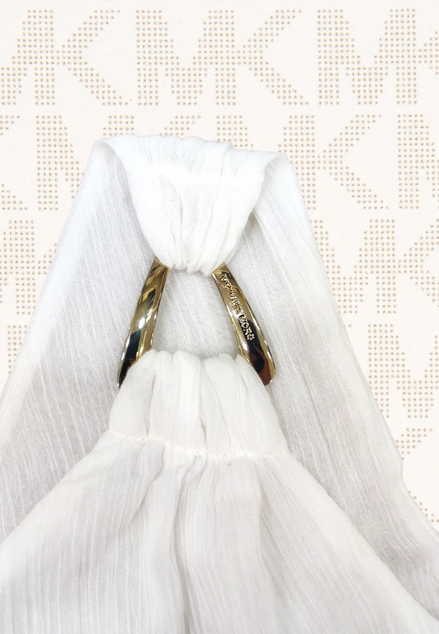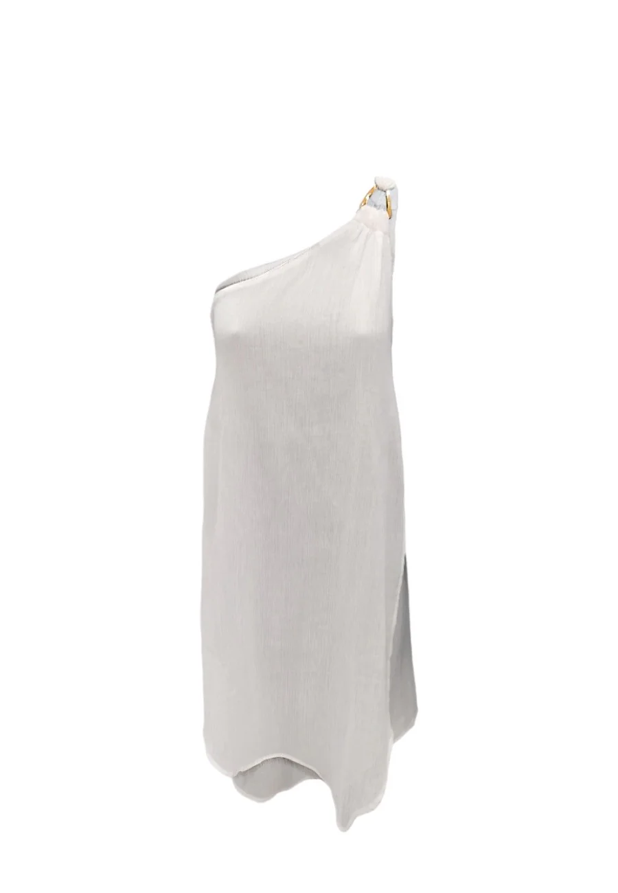 Abitino copricostume monospalla con applicazione MK in metallo galvanizzato. Realizzato in leggerissimo cotone operato effetto chiffon e composto dalla sovrapposizione di piรน veli