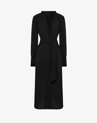 Abito scivoloso in Georgette colore nero, dalle linee molto morbide e manica lunga. Il modello รจ completato da una cintura in vita realizzata con lo stesso tessuto dell’abito. tessuto: 100% Poliestere