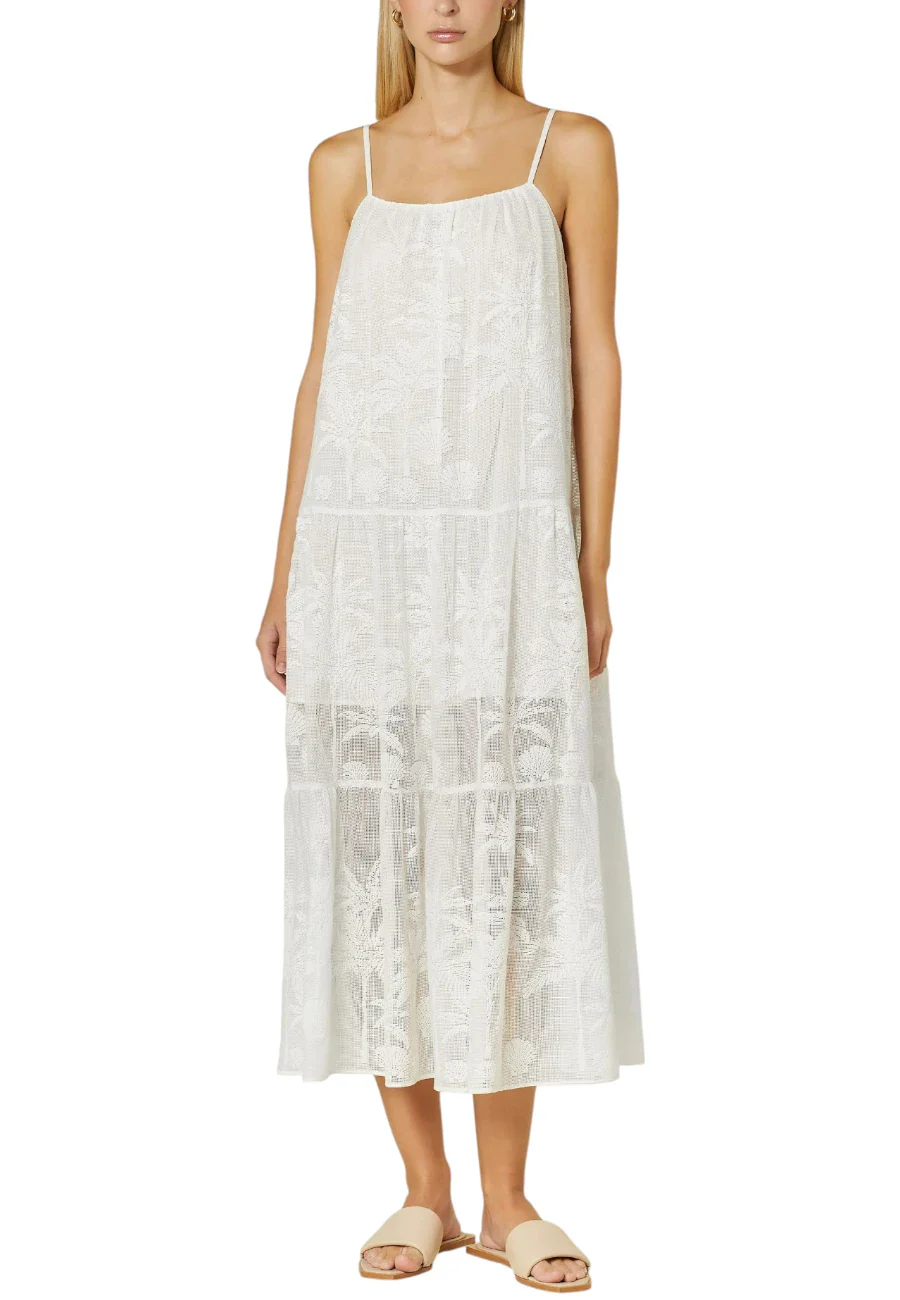 Leggerissimo abito lungo in tulle di cotone con lavorazione di palme e conchiglie. Ha bretelle sottili regolabili e balze con arriccio che gli danno una linea ampia e una vestibilita’ over. Una sottana interna in mussola di cotone chiude la trasparenza fin sopra il ginocchio
