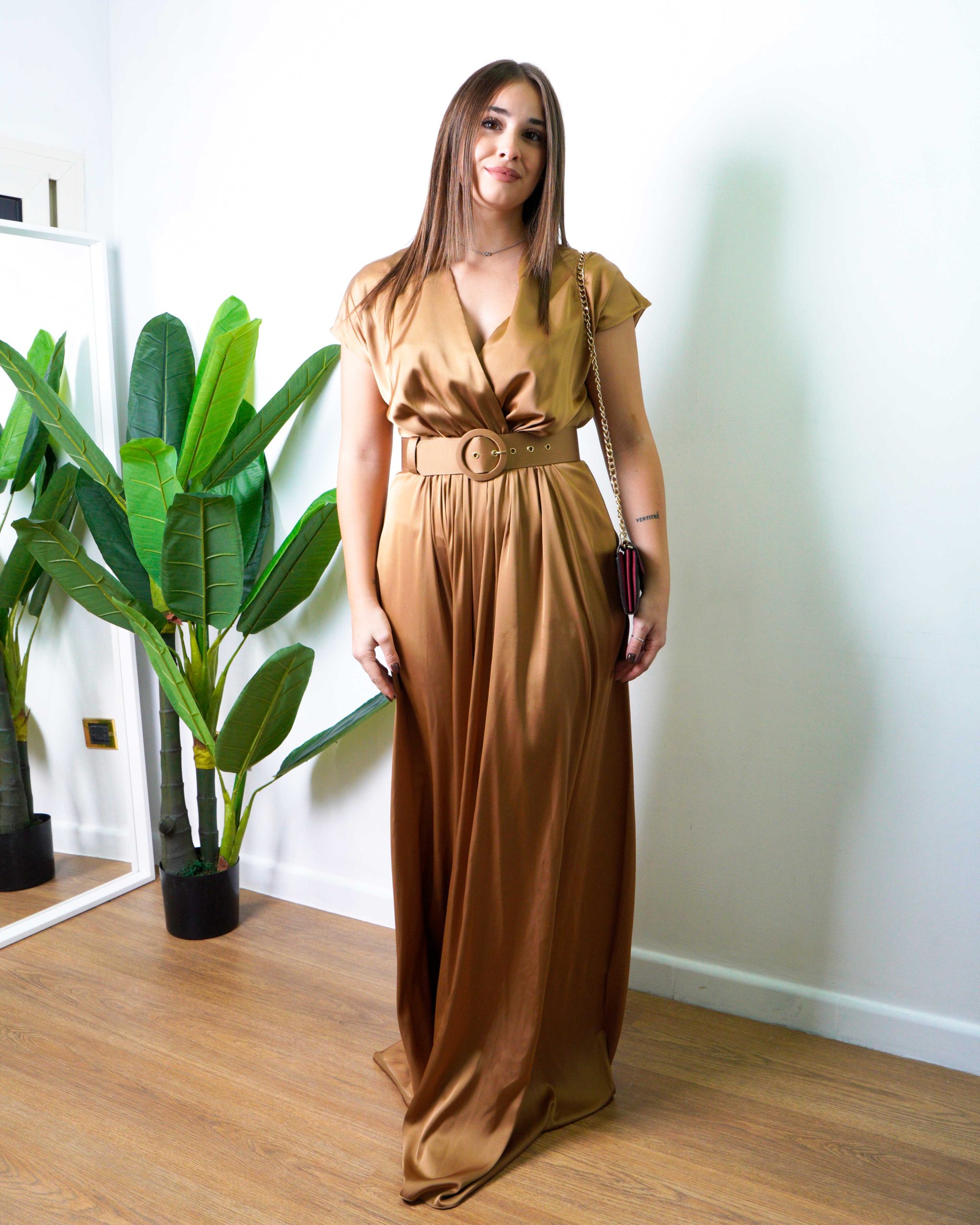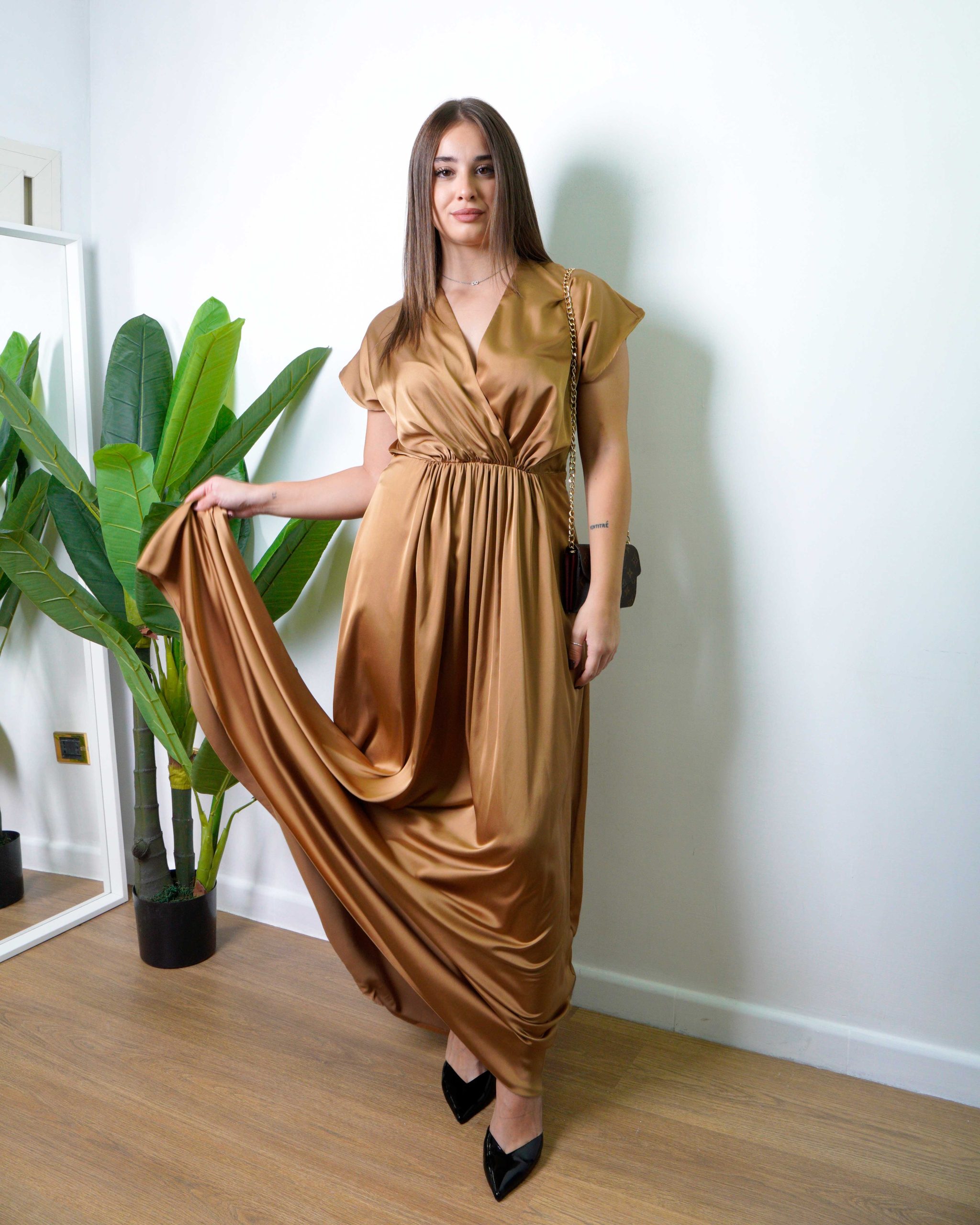 Abito lungo in satin con maniche corte e scollo a V, perfetto per un look elegante e raffinato.