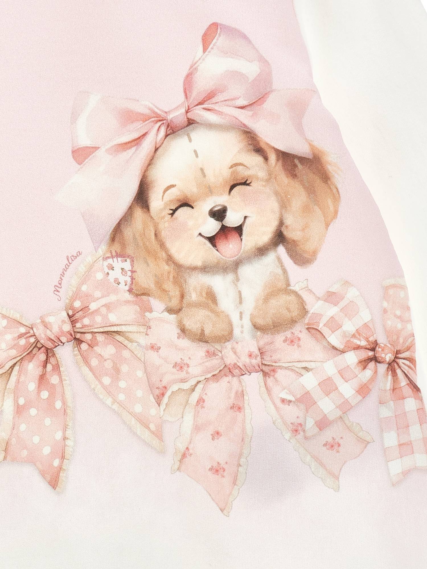 Abito per neonata Monnalisa panna con stampa cucciolo e fiocchi. Il prodotto presenta una chiusura posteriore con bottone a pressione, scollo rotondo, maniche lunghe.