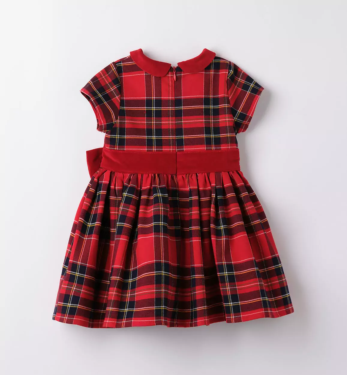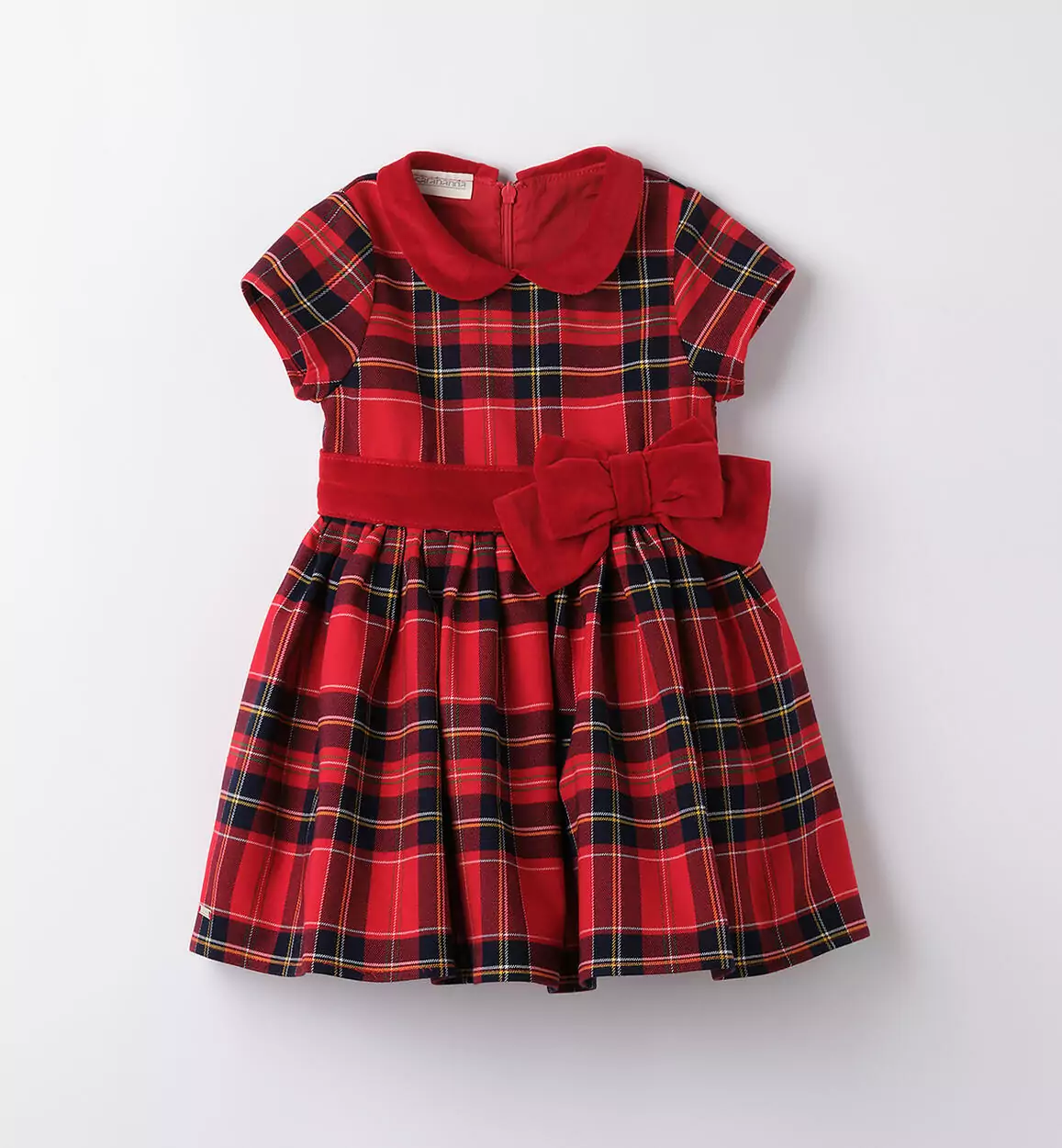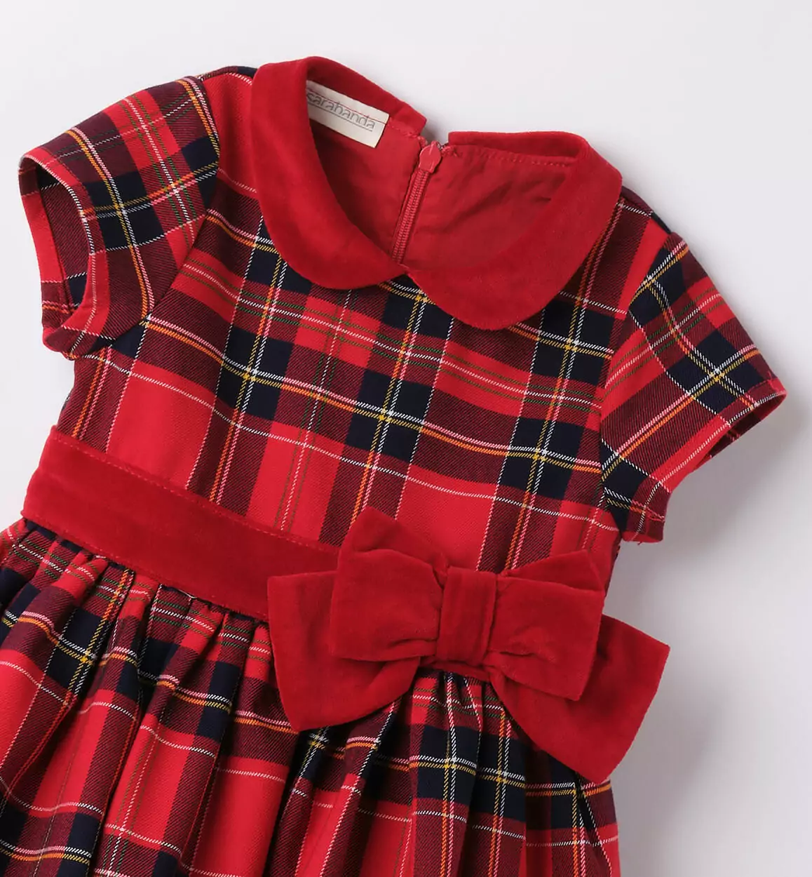 Abito per bambina Sarabanda realizzate in tessuto twill mano pesca. Modello con apertura sul retro con zip, maniche corte e fantasia natalizia con fiocco in vita. Si tratta di un articolo foderato, con vestibilitร mini.