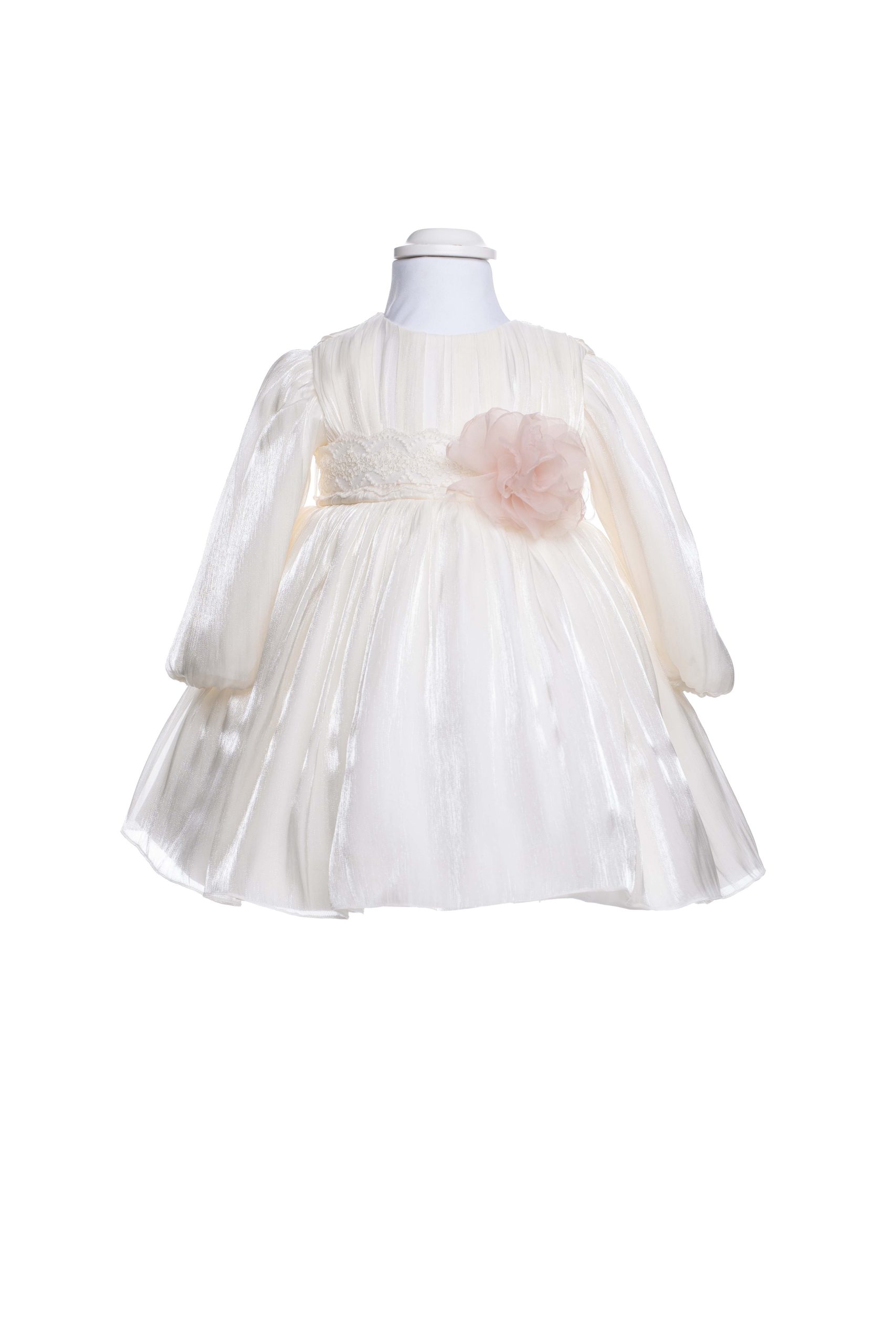 Abito elegante Battesimale e per eventi importanti, color vaniglia/rosa, in chiffon effetto acqua con fascia rimovibile in pizzo macrame' e con spilla a fiore rosa anch'essa rimovibile, maniche lunghe e girocollo.