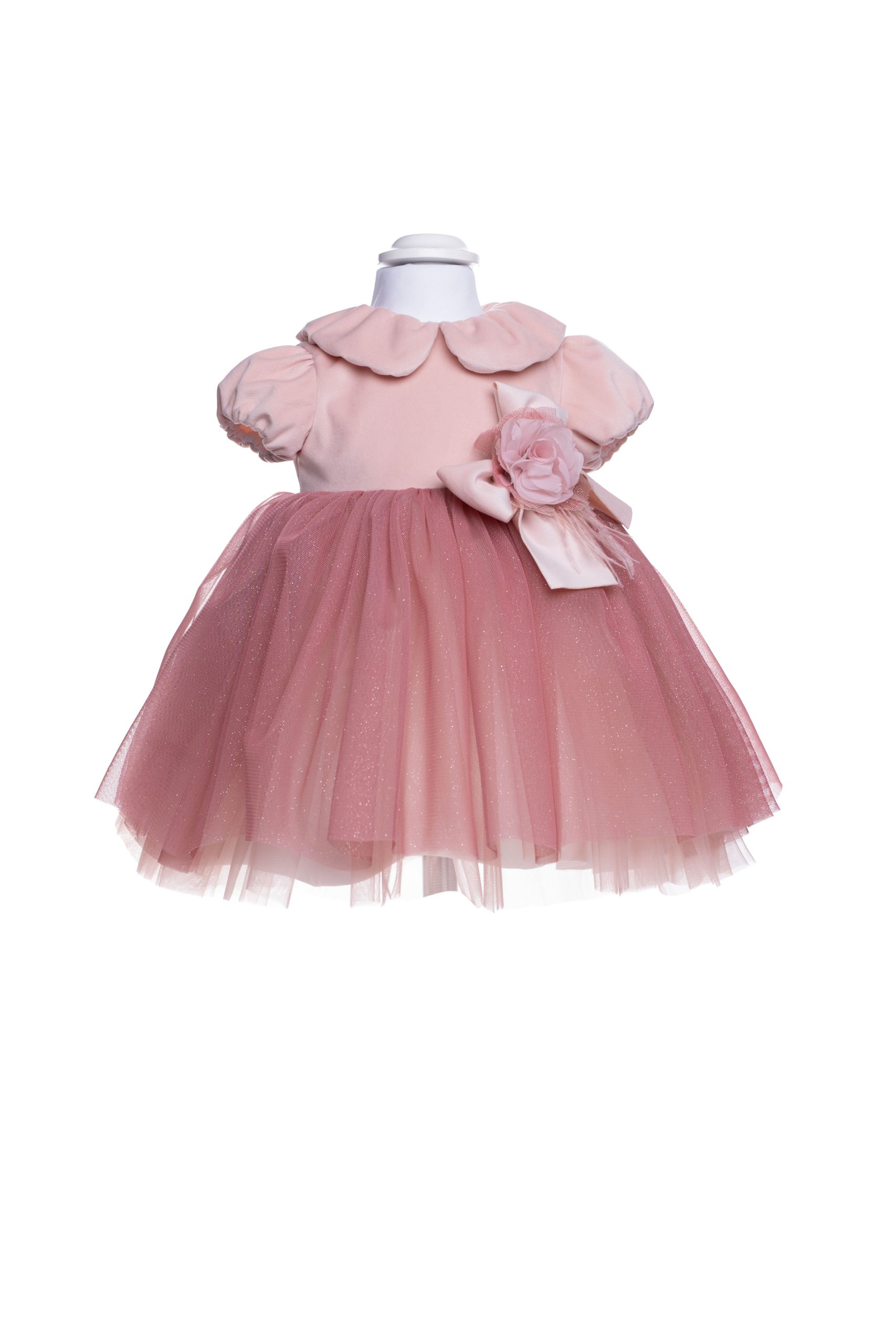 Abito per neonata a mezza manica con corpetto in velluto rosa e gonnellone in tulle bicolor ciclamino. In vita presenta un bellisimo fioccone in abbinamento con i colori dell'abito.