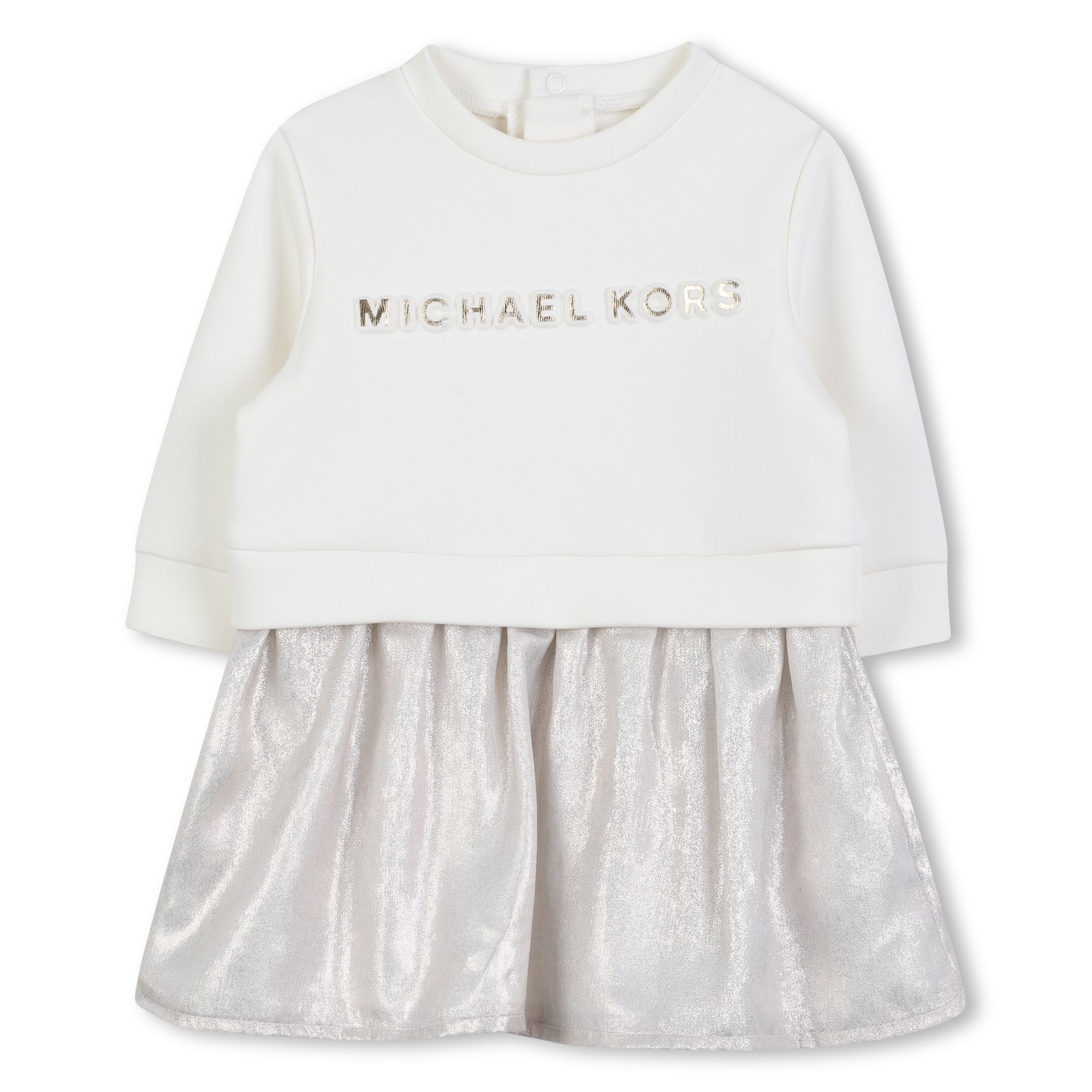 Abito per neonata colore bianco e oro; Corpetto in felpina a manica lunga con logo in rilievo e gonnellino in lurex laminato oro.