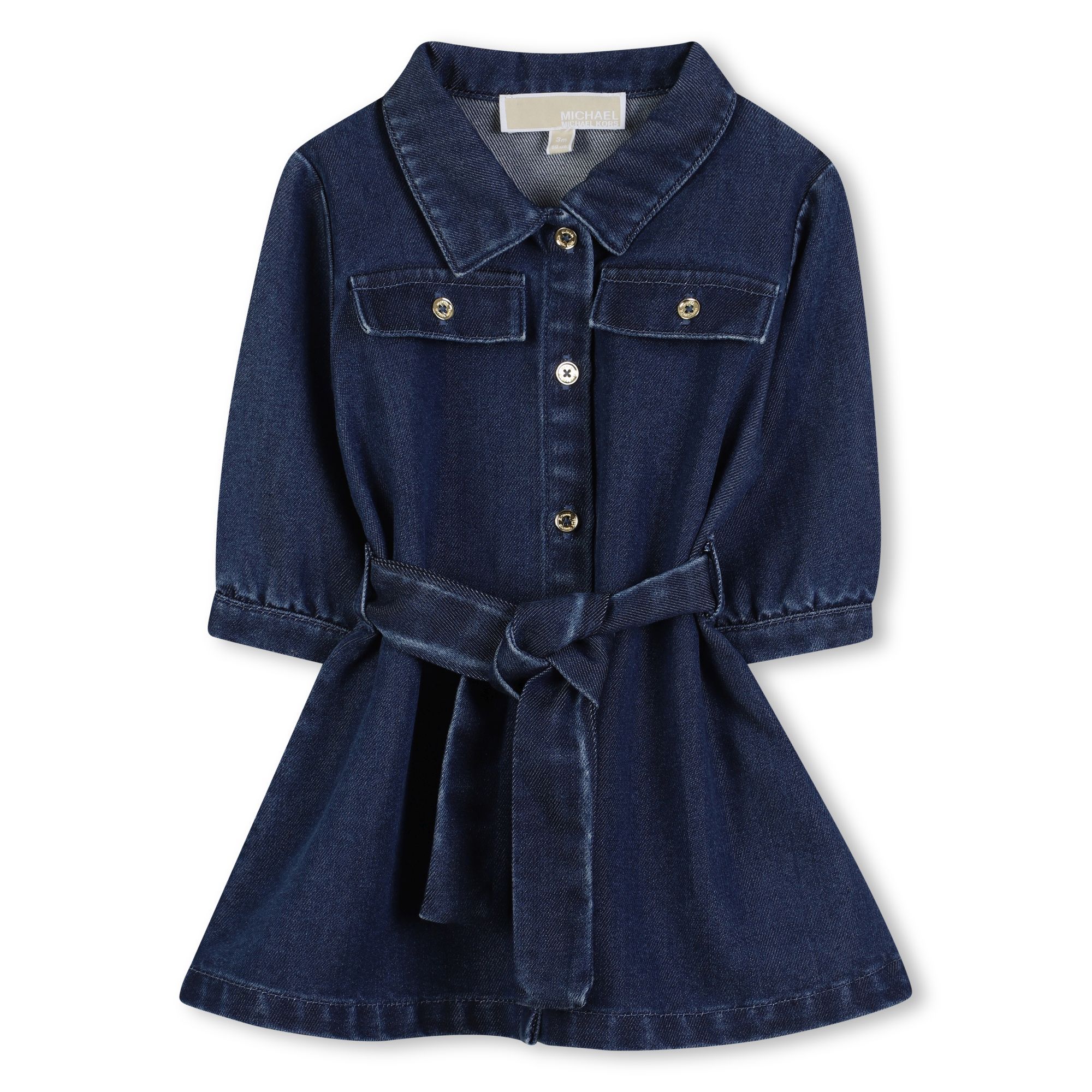 Mini abito in jeans a manica lunga con bottoni anteriori e cintura in vita.