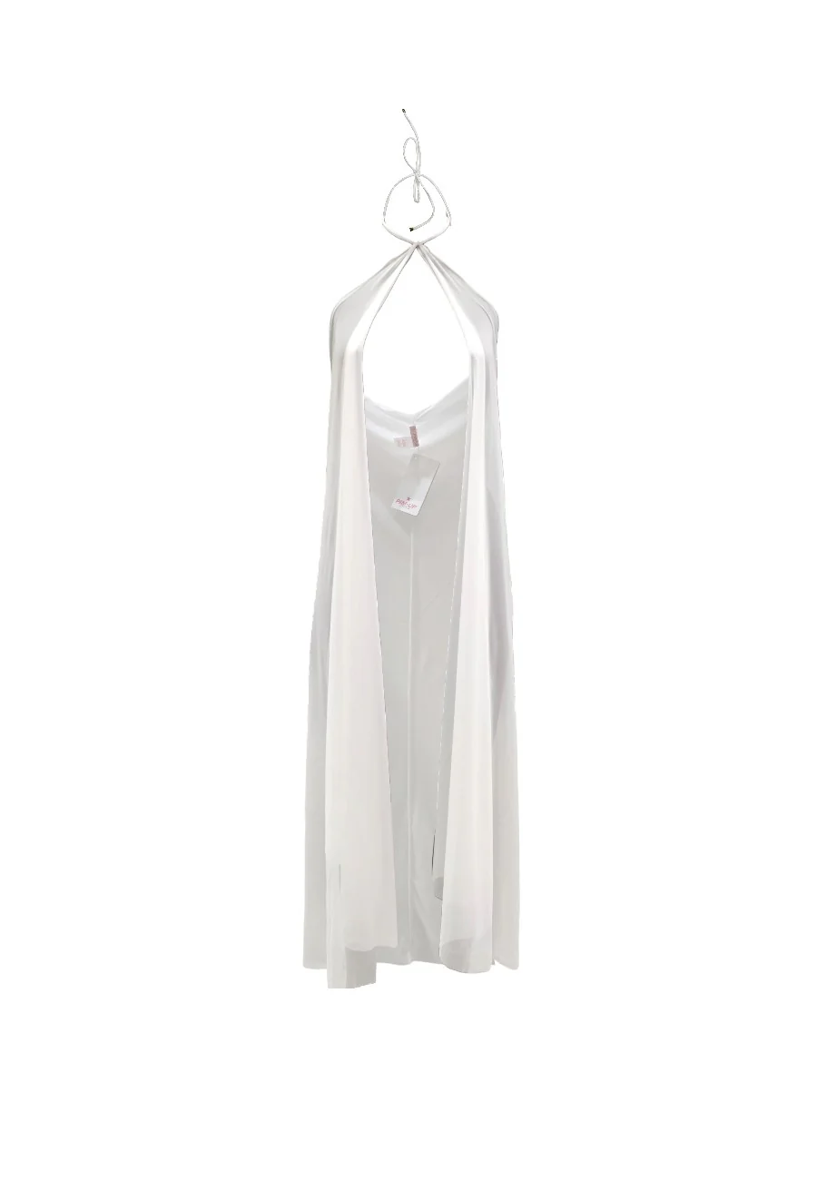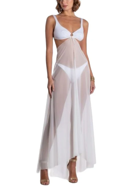 Capo in tulle tinta unita estremamente versatile, puรฒ essere utilizzato in diversi modi. Come abito pareo allacciato al collo o allโaccessorio dorato nel centro seno caratteristico di molti bikini della collezione, oppure utilizzato come gonna pareo a vita bassa. Comodo e versatile per ogni occasione.