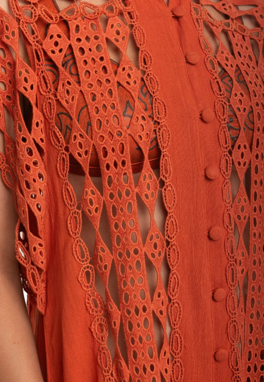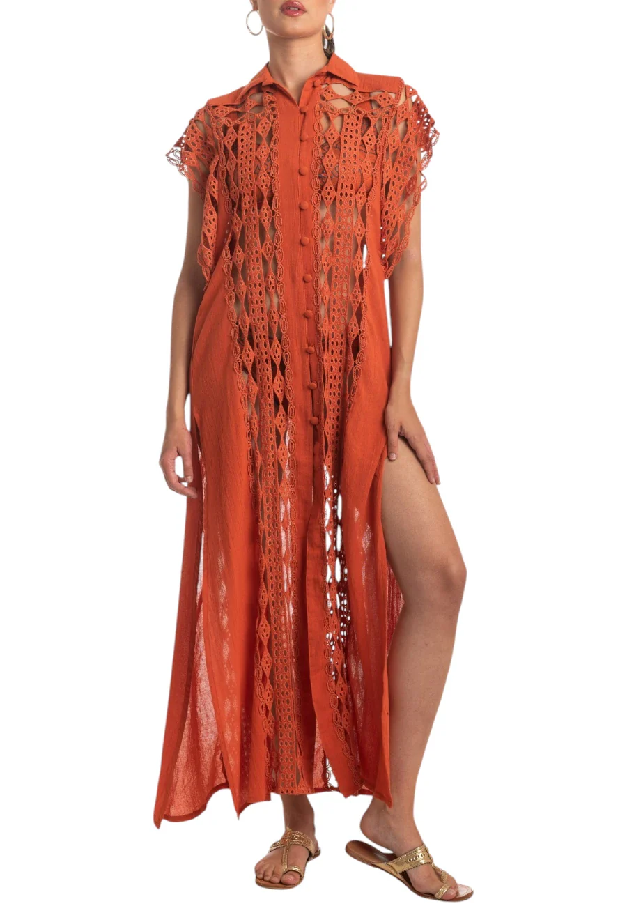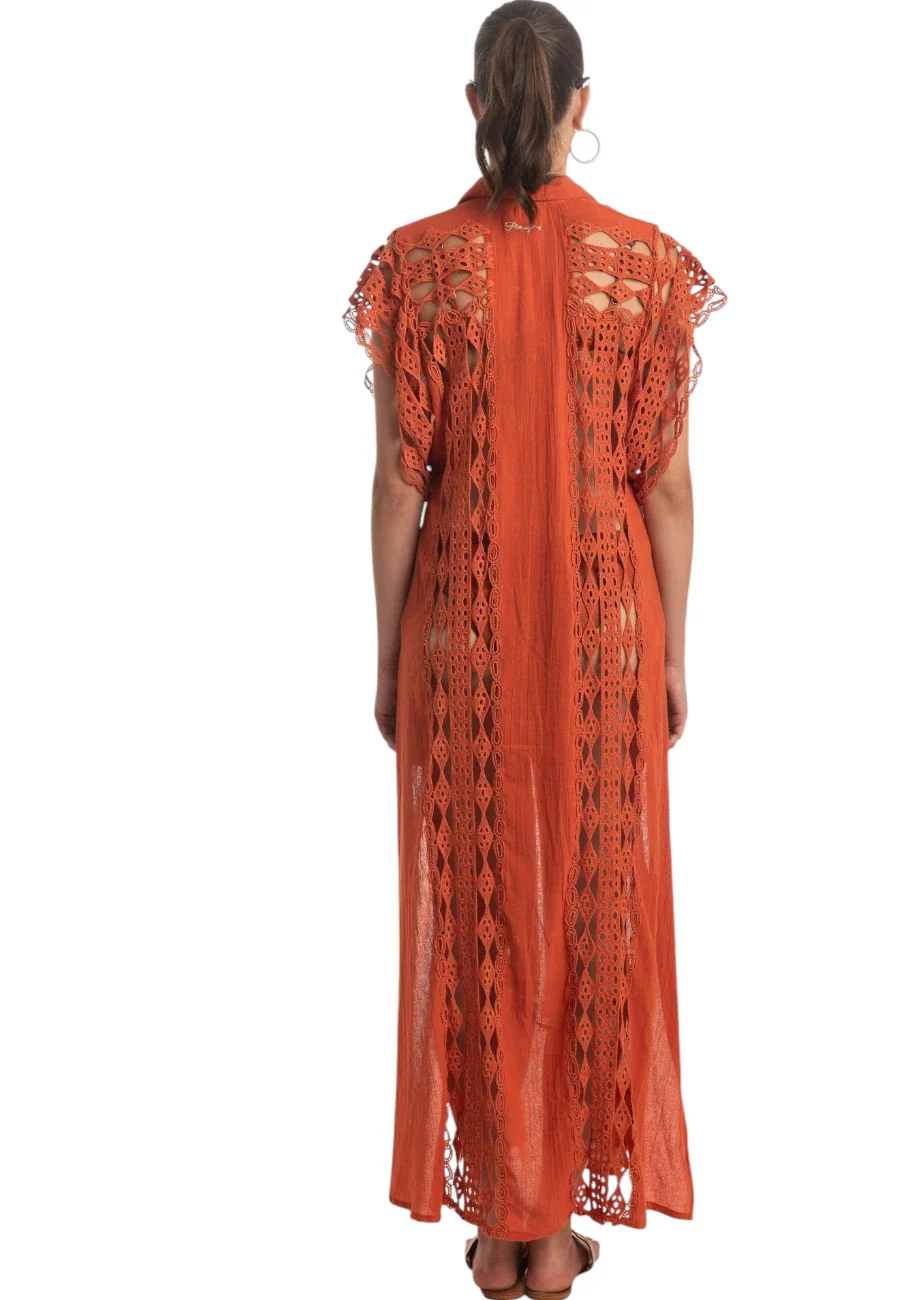 Abito lungo chemisier in cotone ricamato e bordi macramè. Profondi spacchi laterali, manica corta a farfalla e bottoncini ricoperti. 100%cotone