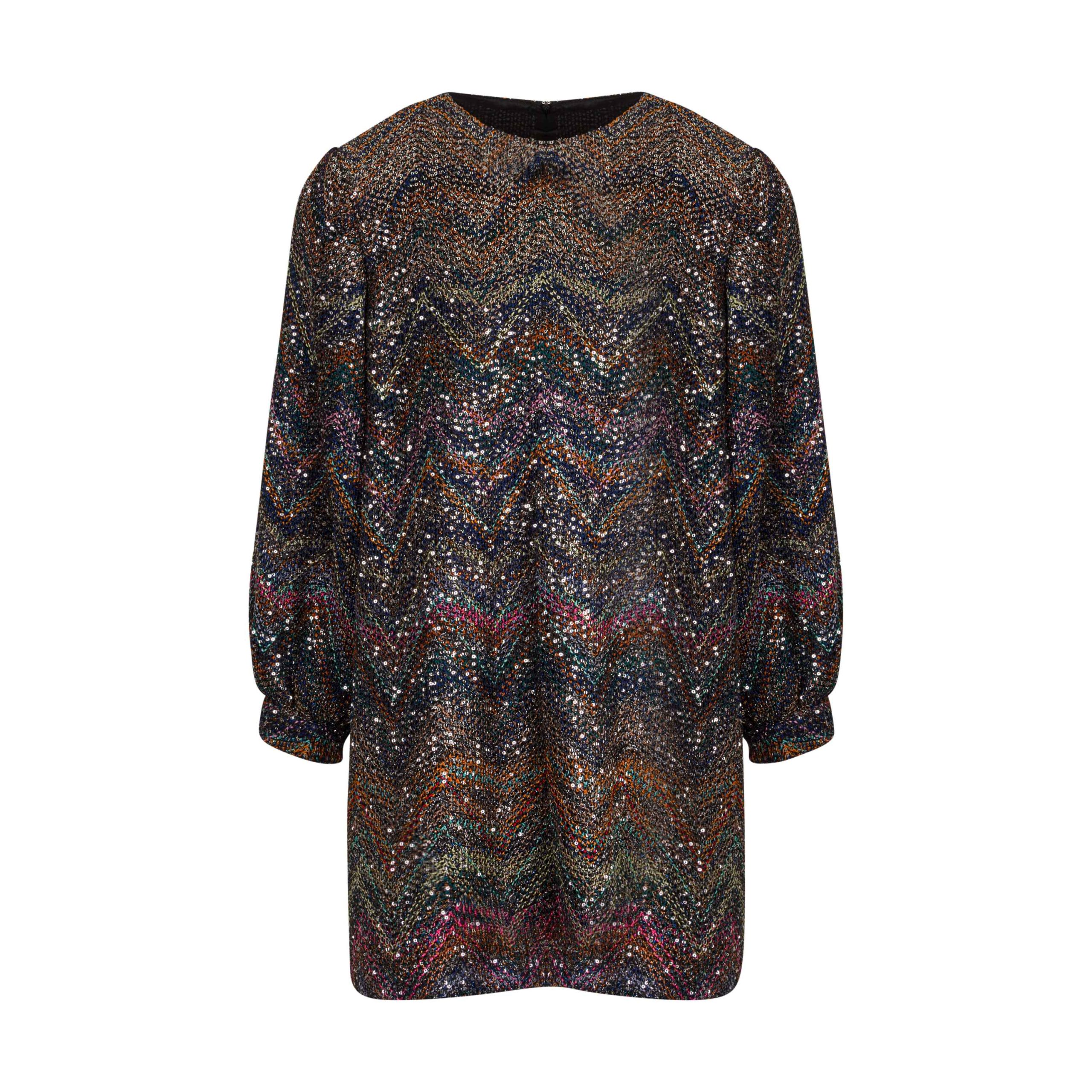 Abito per ragazze a manica lunga fondo nero e motivo chevron all-over contornato di paillettes.Elegante e sobrio.