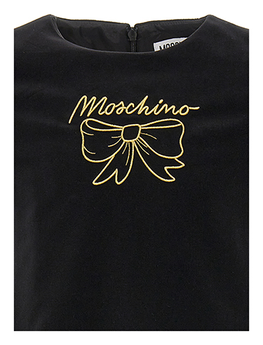 Abito Moschino in vellutino nero a mezza manica, taglio midi e scollo tonfo. Logo ricamato centrale in contrasto oro con scritta e fiocco.