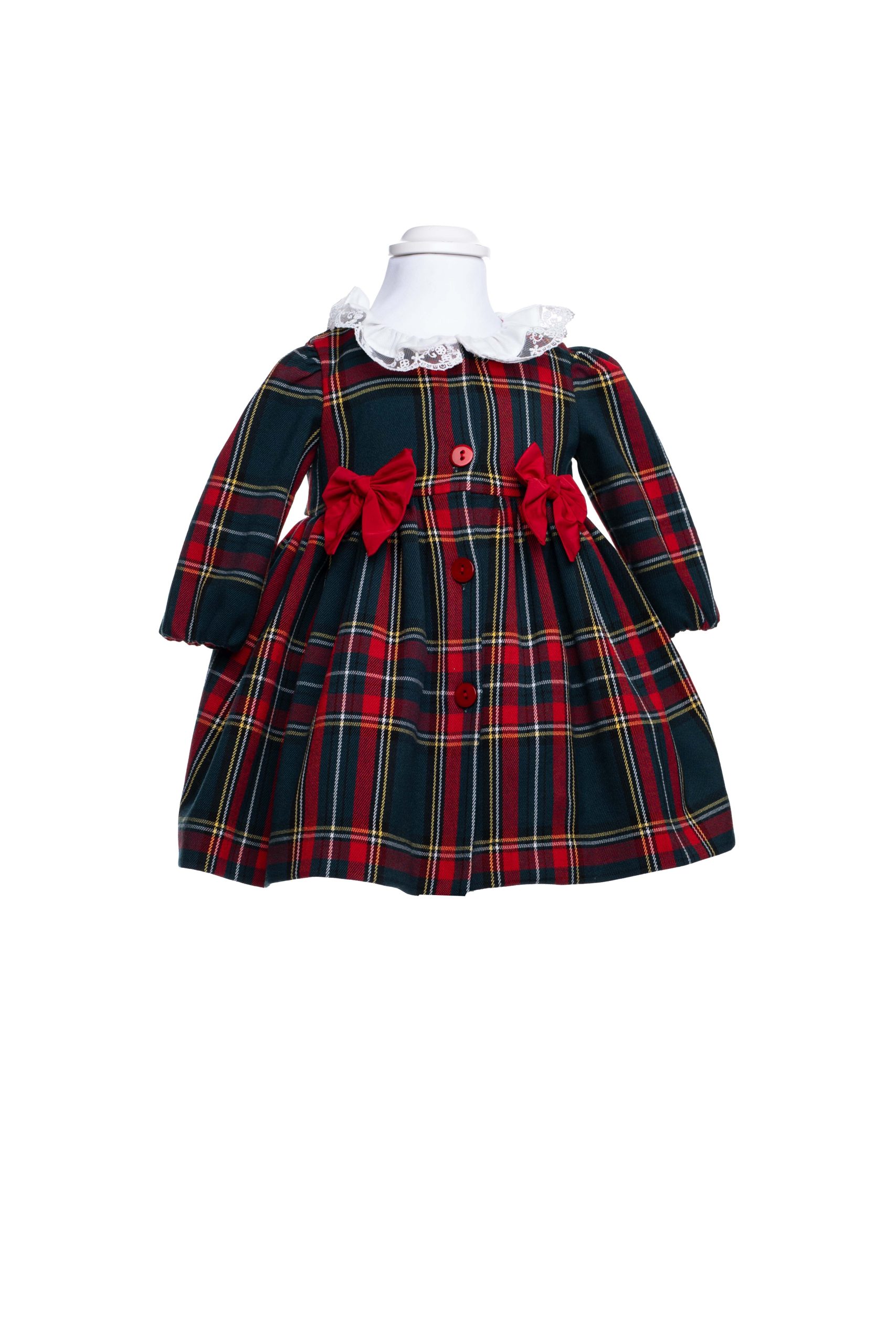 Abito in tartan rosso e verde a manica lunga per neonata con colletto bianco e fiocchi colore rosso.