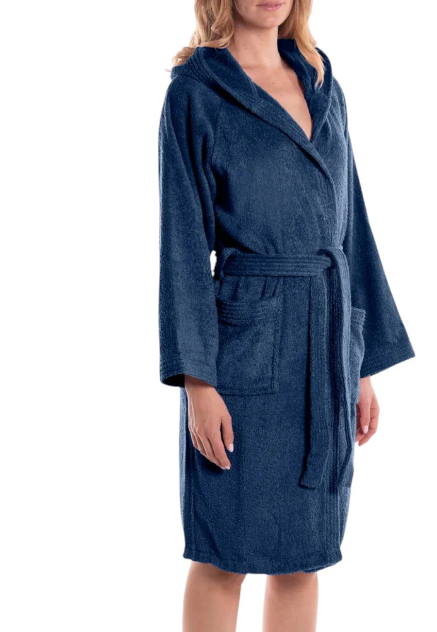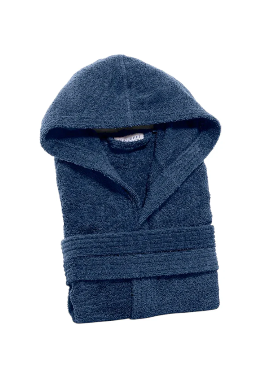 Accappatoio Caleffi con cappuccio in puro cotone idrofilo. 450gr/mq. Colore indigo 100% cotone