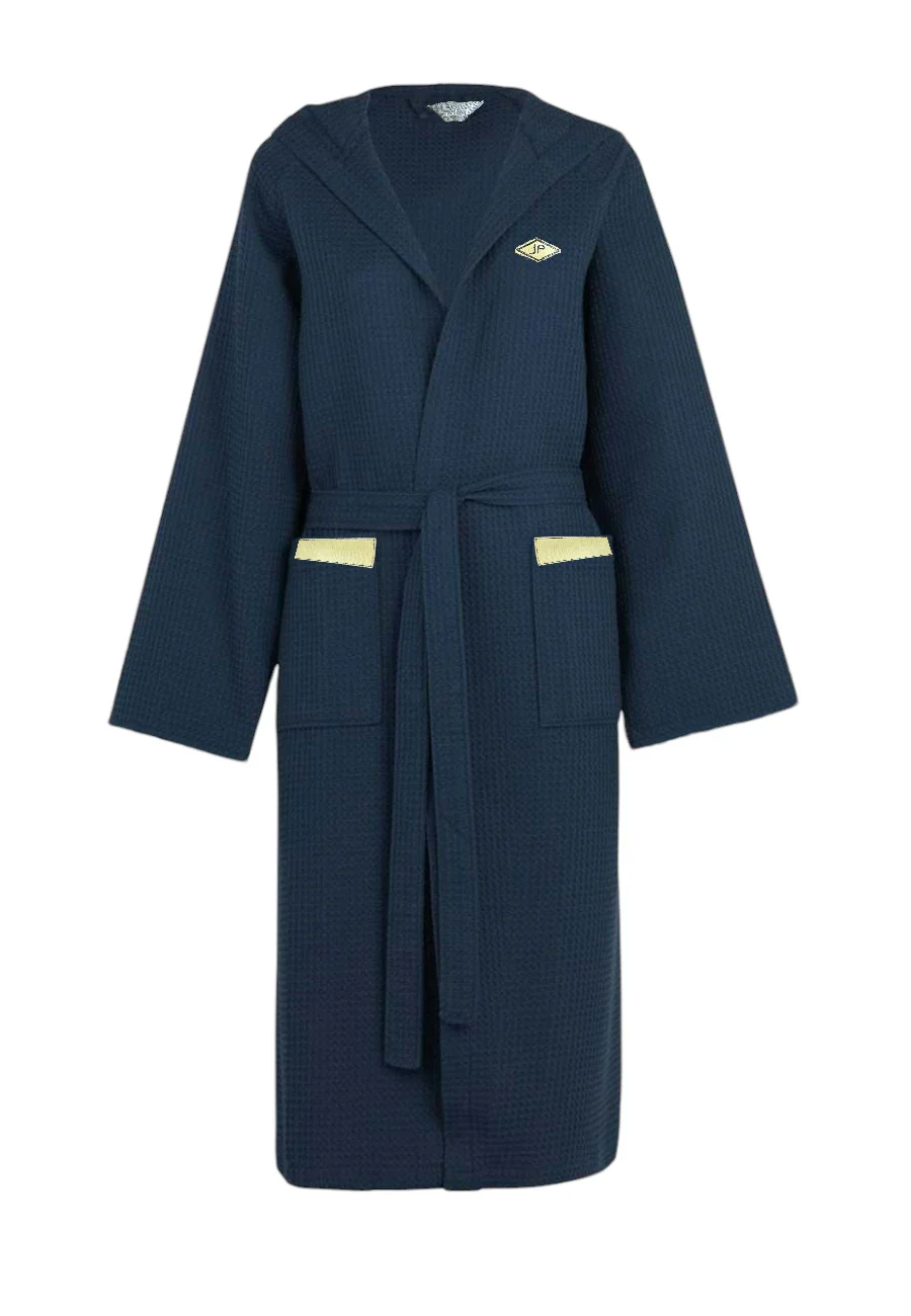 accappatoio con cappuccio in morbida spugna a nido d’ape con profili tasche a contrasto.