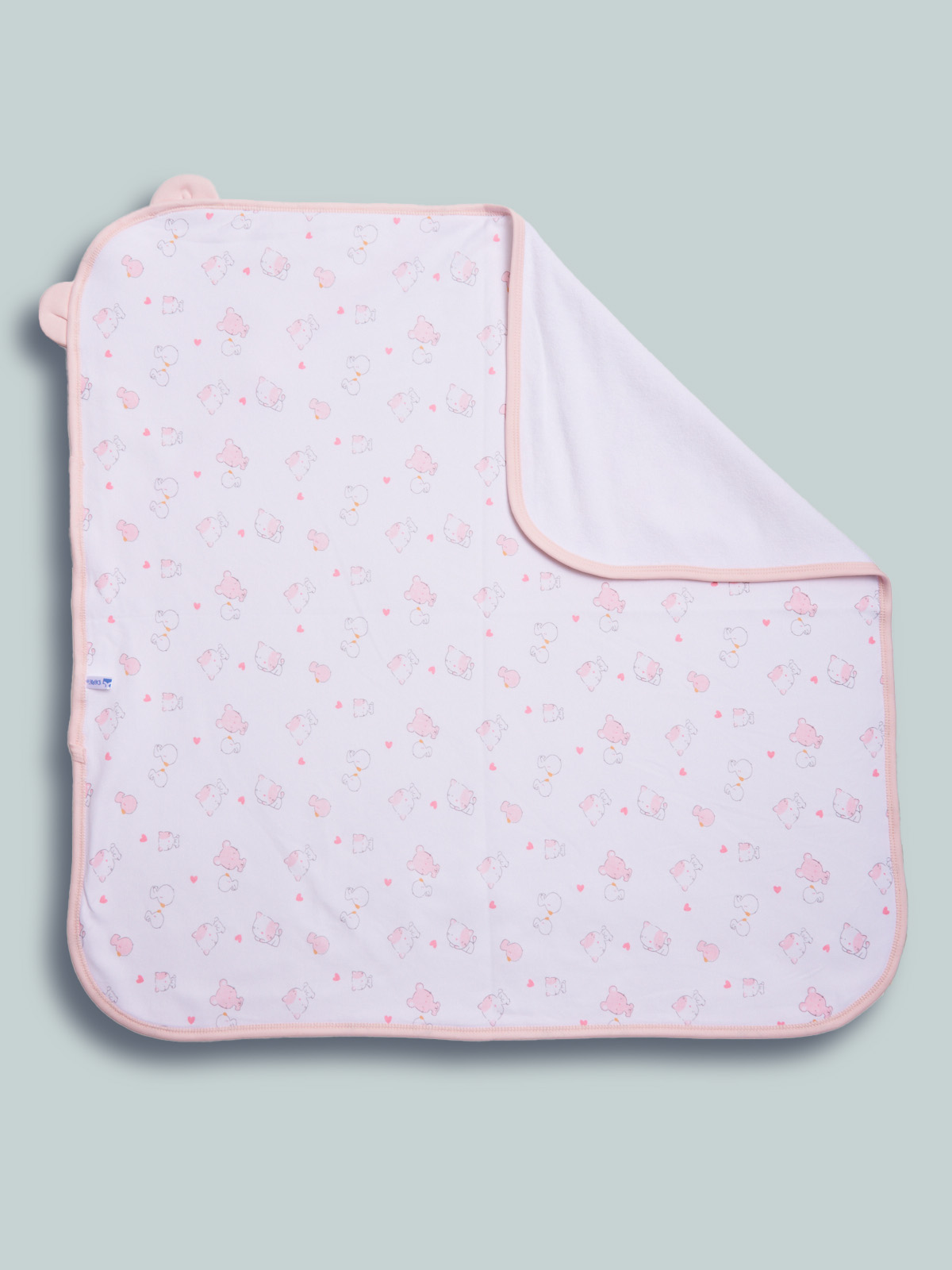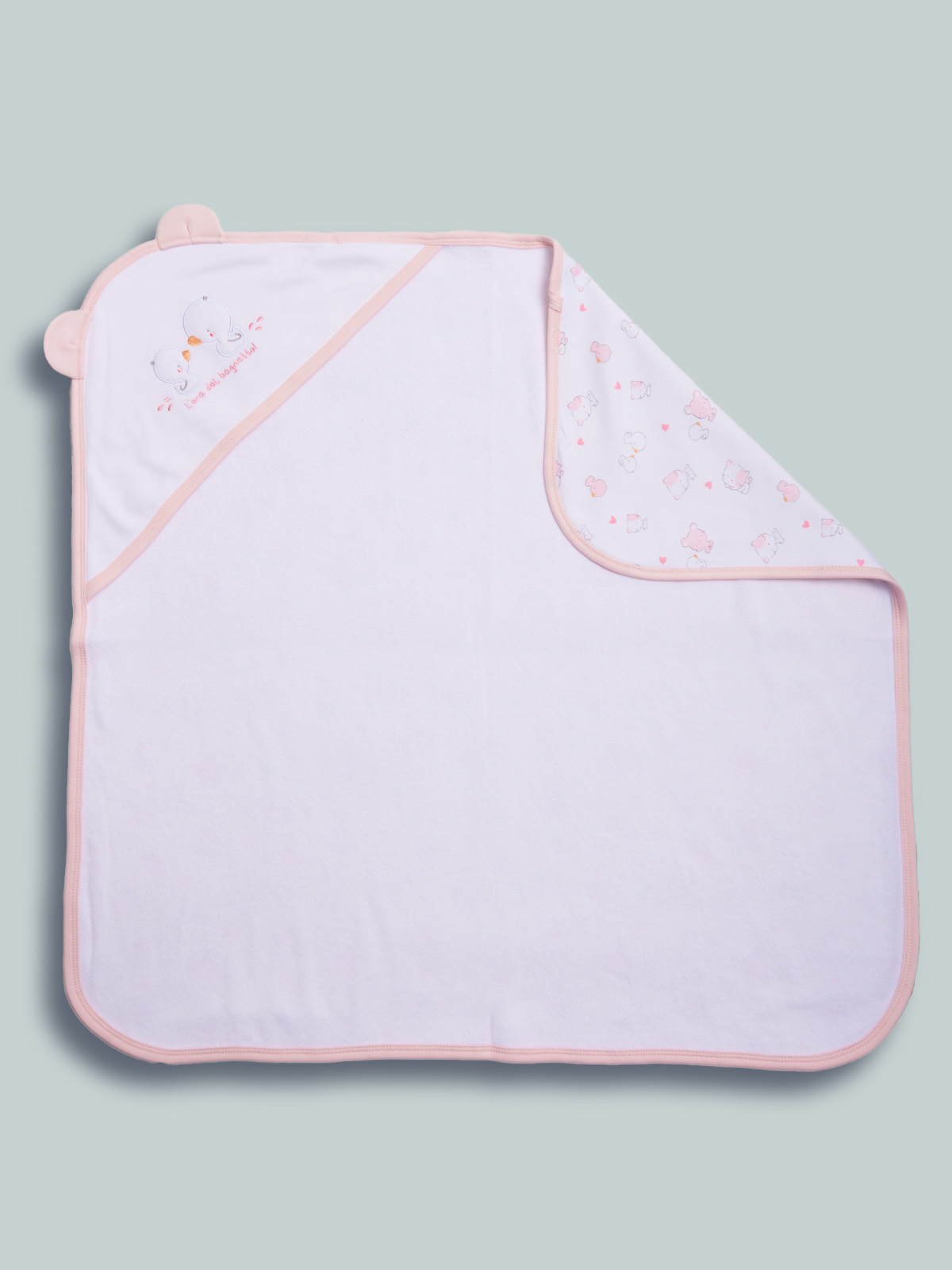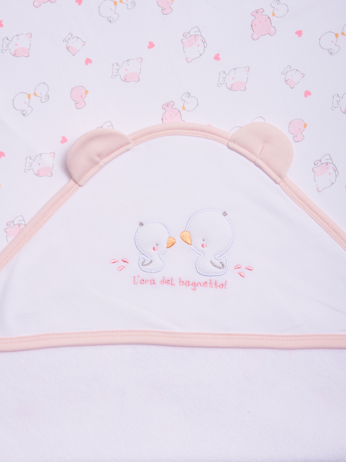 Avvolgente asciugamano con la quale potrai asciugare il tuo neonato dopo il bagnetto. Tessuto spugna 100% cotone. Elemento decorativo: ricamo e orecchie 3D. Questo accessorio fa parte del corredino composto da tutti gli articoli indispensabili per il tuo neonato.