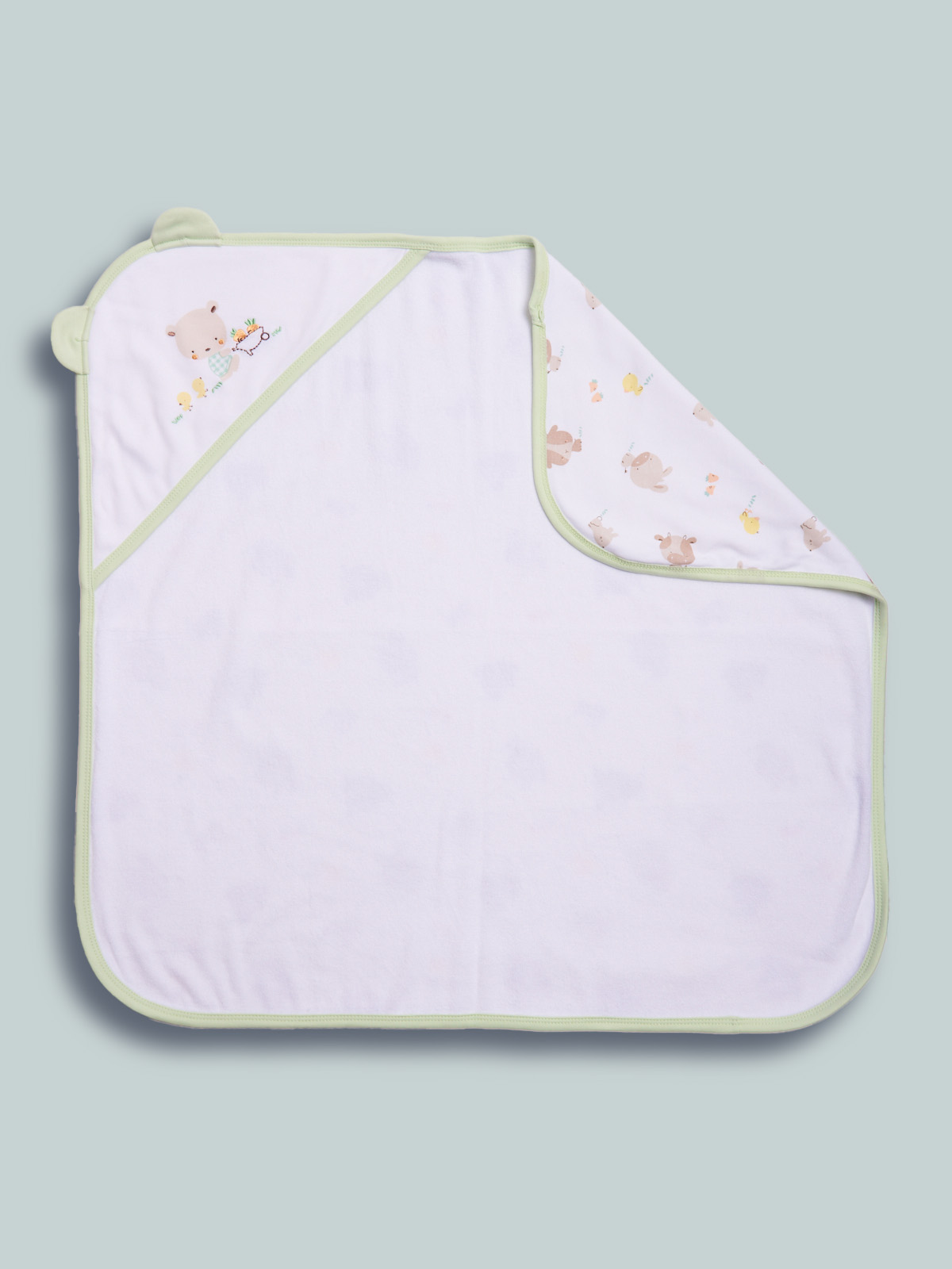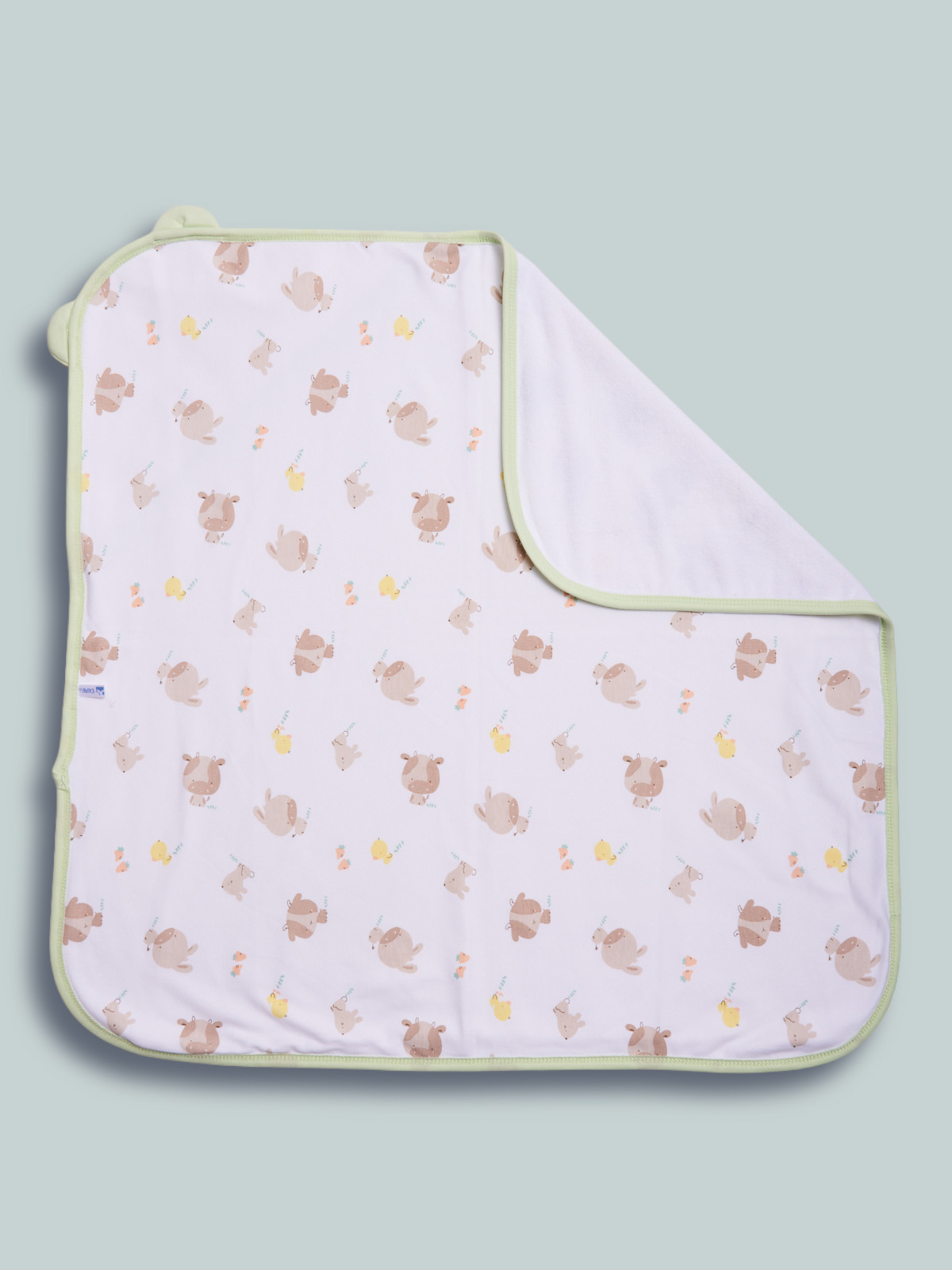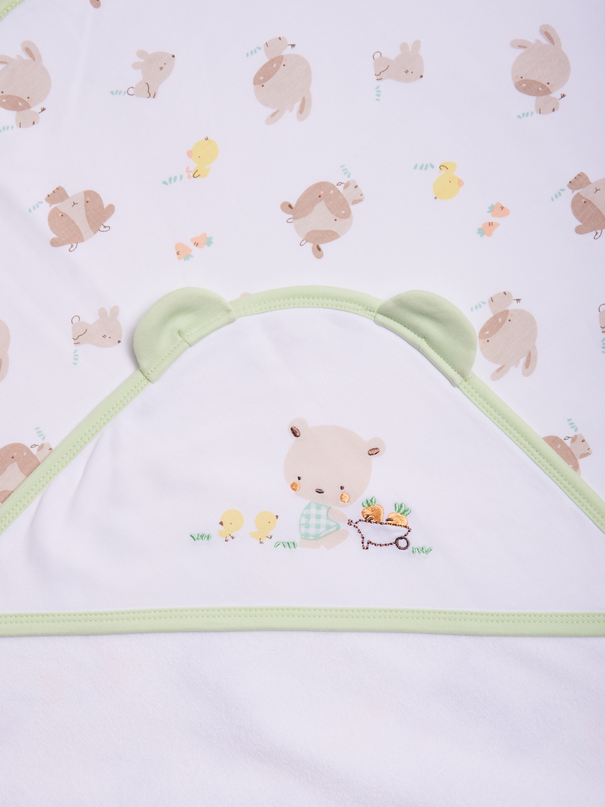 Avvolgente asciugamano con la quale potrai asciugare il tuo neonato dopo il bagnetto. Tessuto spugna 100% cotone. Elemento decorativo: ricamo e orecchie 3D. Questo accessorio fa parte del corredino composto da tutti gli articoli indispensabili per il tuo neonato.