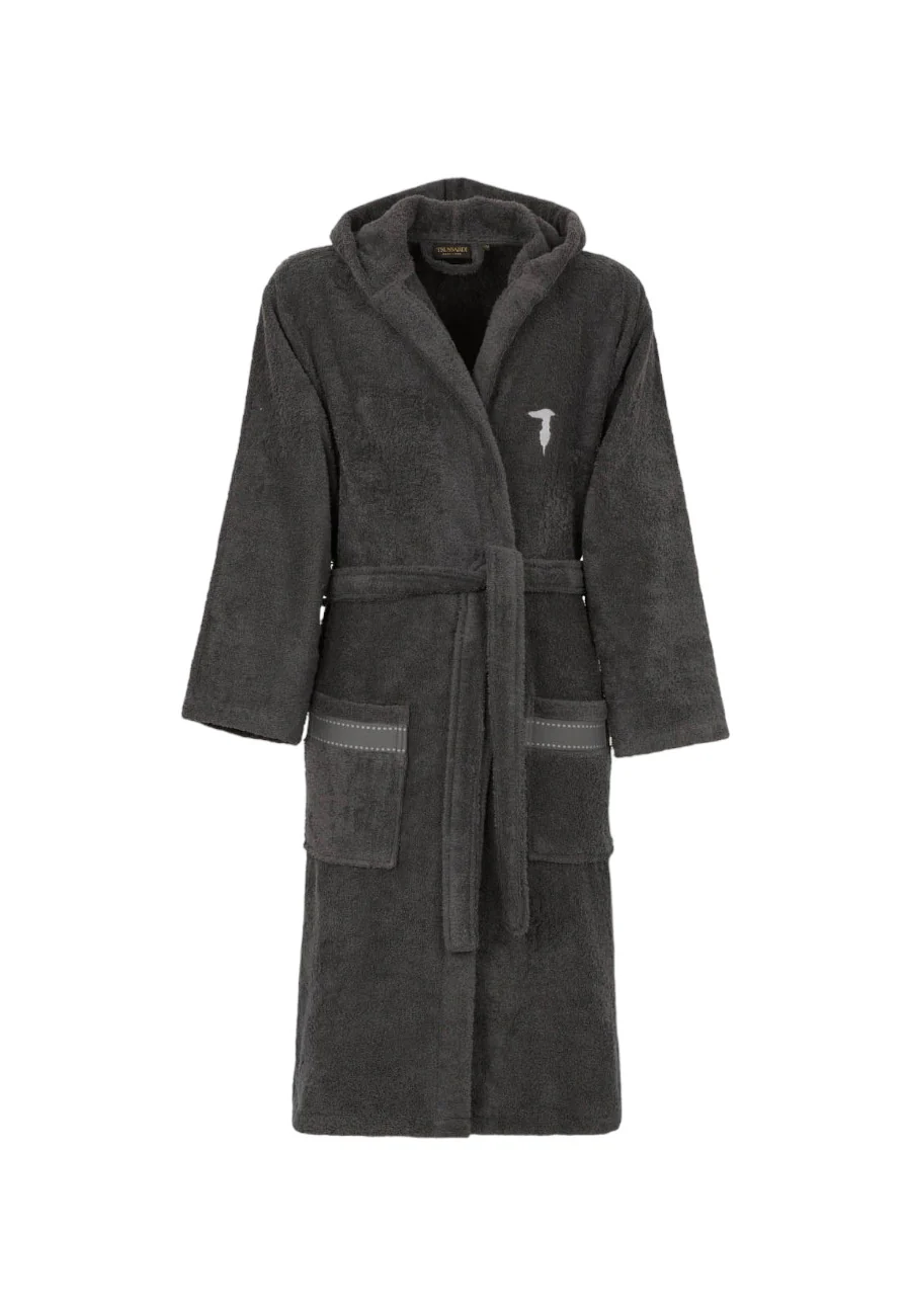 Accappatoio con cappuccio Trussardi Ribbon in Spugna, logo anteriore e dettagli sulle tasche.
