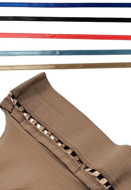 Calza autoreggente 20 Den con lycra , setificata opaca, velatissima, con balza liscia con particolare lavorazione traforata che consente l’inserimento di nastri tono su tono o in colore a contrasto. (5 nastrini colorati inclusi) Made in Italy 89% poliammide 11% elastan