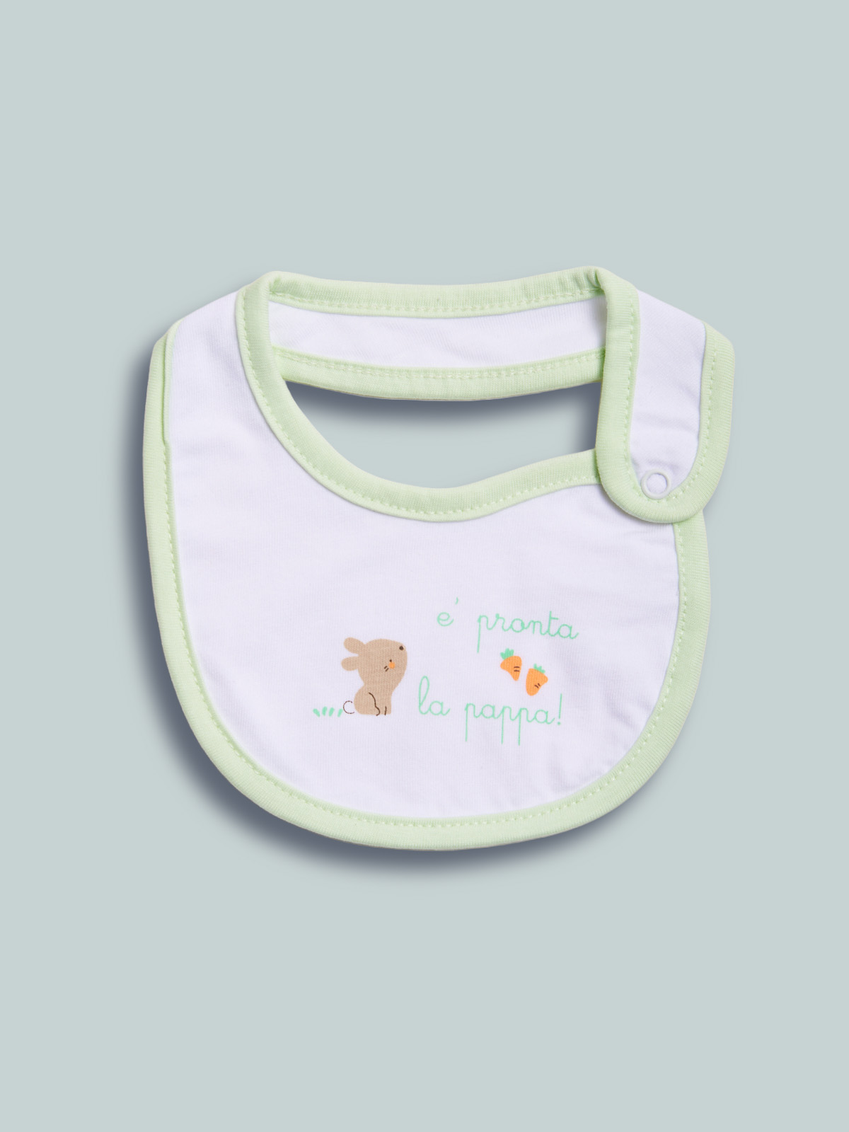 Bavetta in cotone decorato con stampa riproposta su altri articoli per completare il tuo corredino. Dotato di un pratico bottone a pressione sulla parte laterale per agevolarne l’indosso. Questo accessorio fa parte del corredino composto da tutti gli articoli indispensabili per il tuo neonato.
