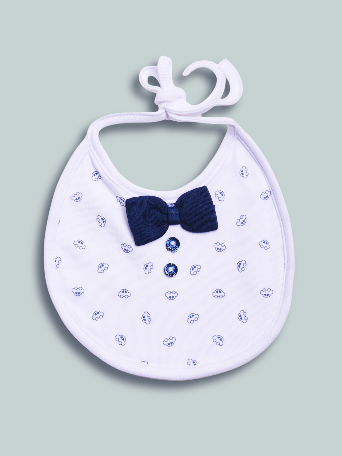 Bavetta per il giorno piรน importante, il Battesimo. Accessorio in cotone con papillon contrasto rifinito da bottoncini madreperla. Ideale per completare il look.
