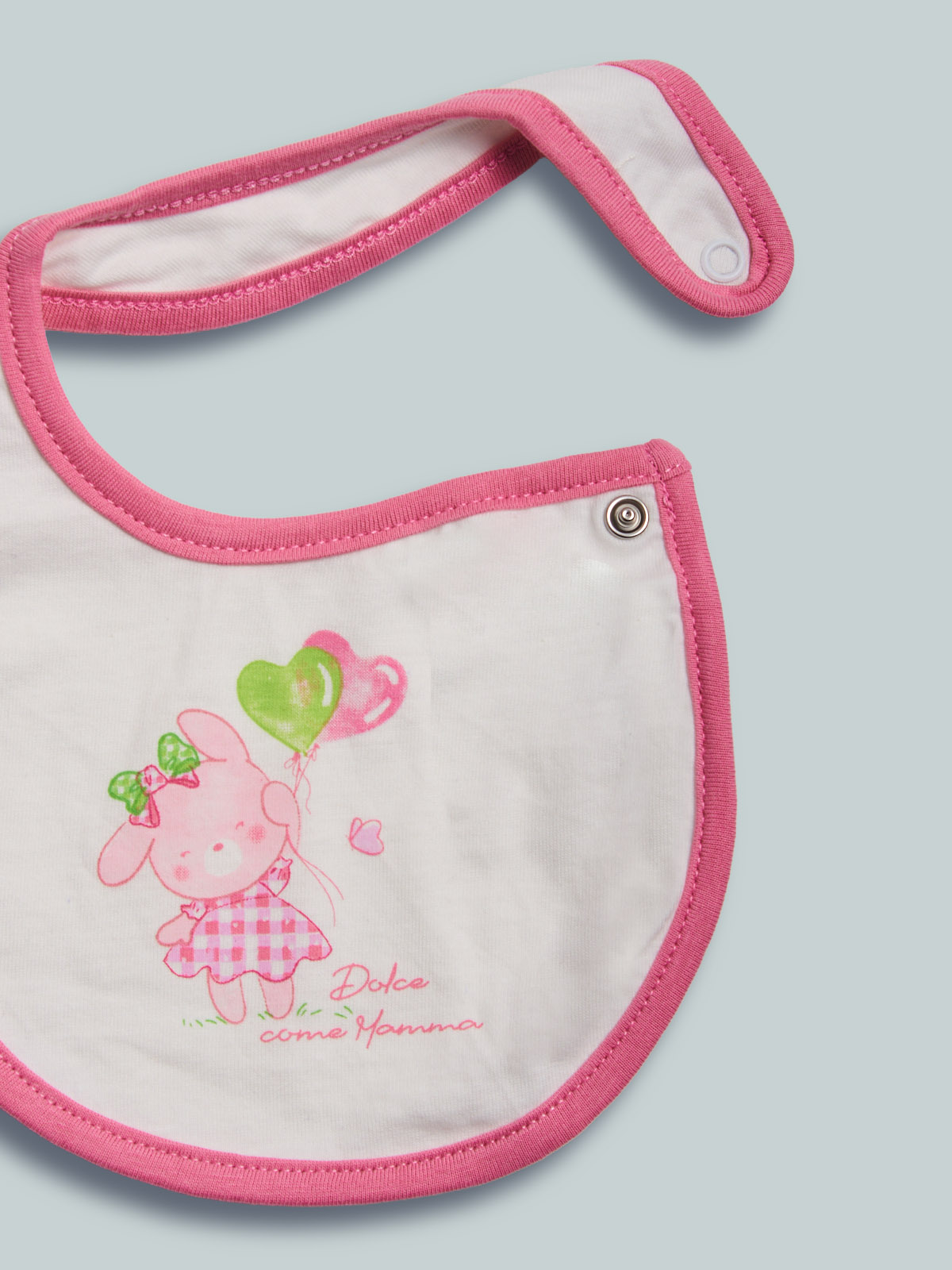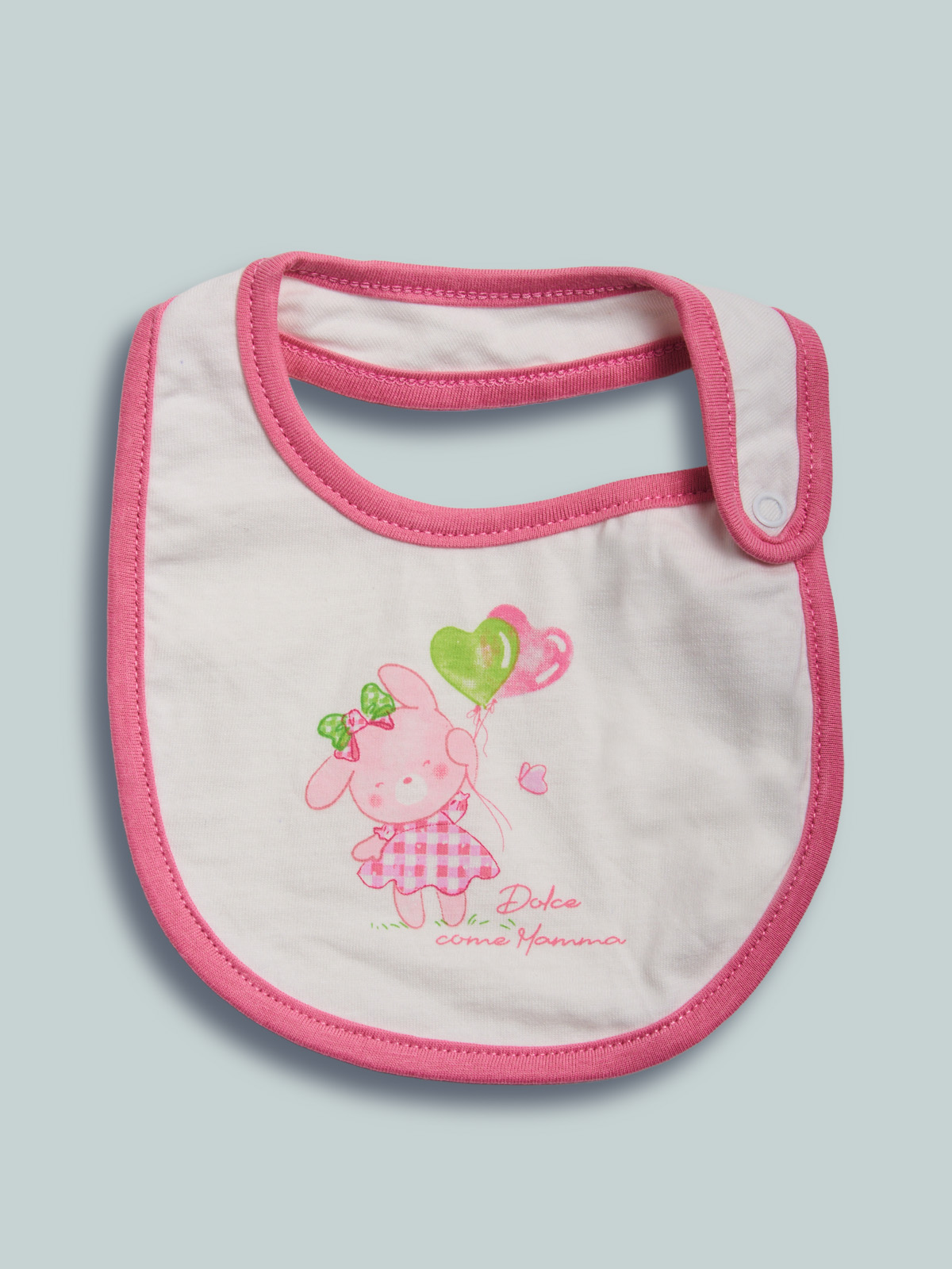Morbido bavaglino doppiato in cotone. Apertura con bottone a pressione. Tenera stampa. Questo accessorio fa parte del corredino composto da tutti gli articoli indispensabili per la tua neonata.
