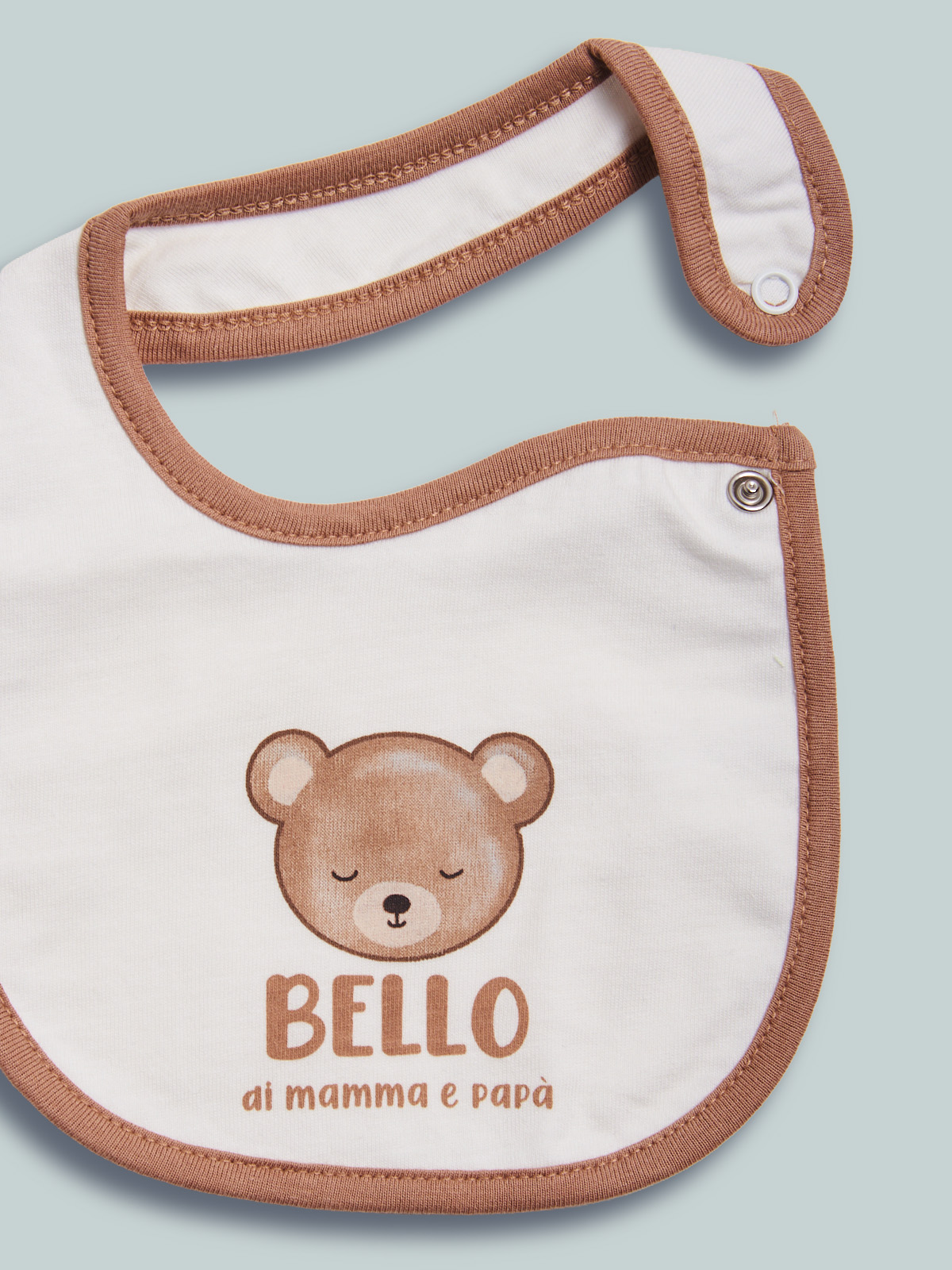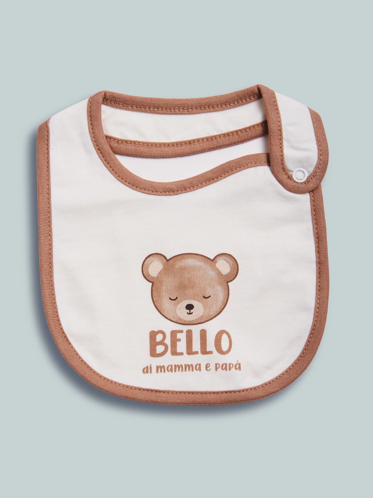 Morbido bavaglino doppiato in cotone. Apertura con bottone a pressione. Tenera stampa. Questo accessorio fa parte del corredino composto da tutti gli articoli indispensabili per la tua neonata.