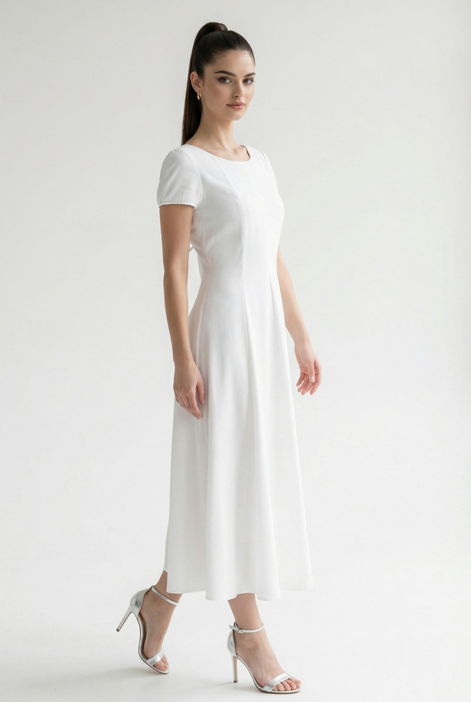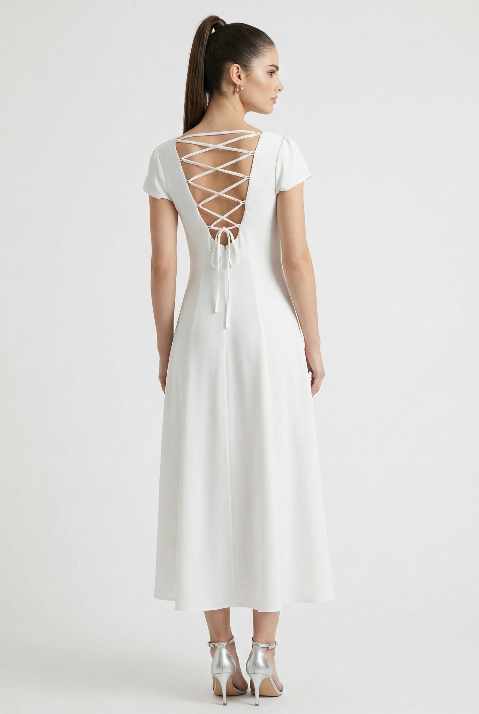 Questo abito rappresenta l’equilibrio perfetto tra comfort sartoriale e dettaglio haute couture. La parte anteriore presenta uno scollo tondo essenziale e maniche corte accennate, mentre la gonna scende fluida con una linea leggermente a trapezio che garantisce una vestibilità morbida e naturale. Il vero protagonista è il retro: una profonda scollatura a V impreziosita da un gioco di lacci incrociati che permette di regolare il fitting in modo personalizzato.