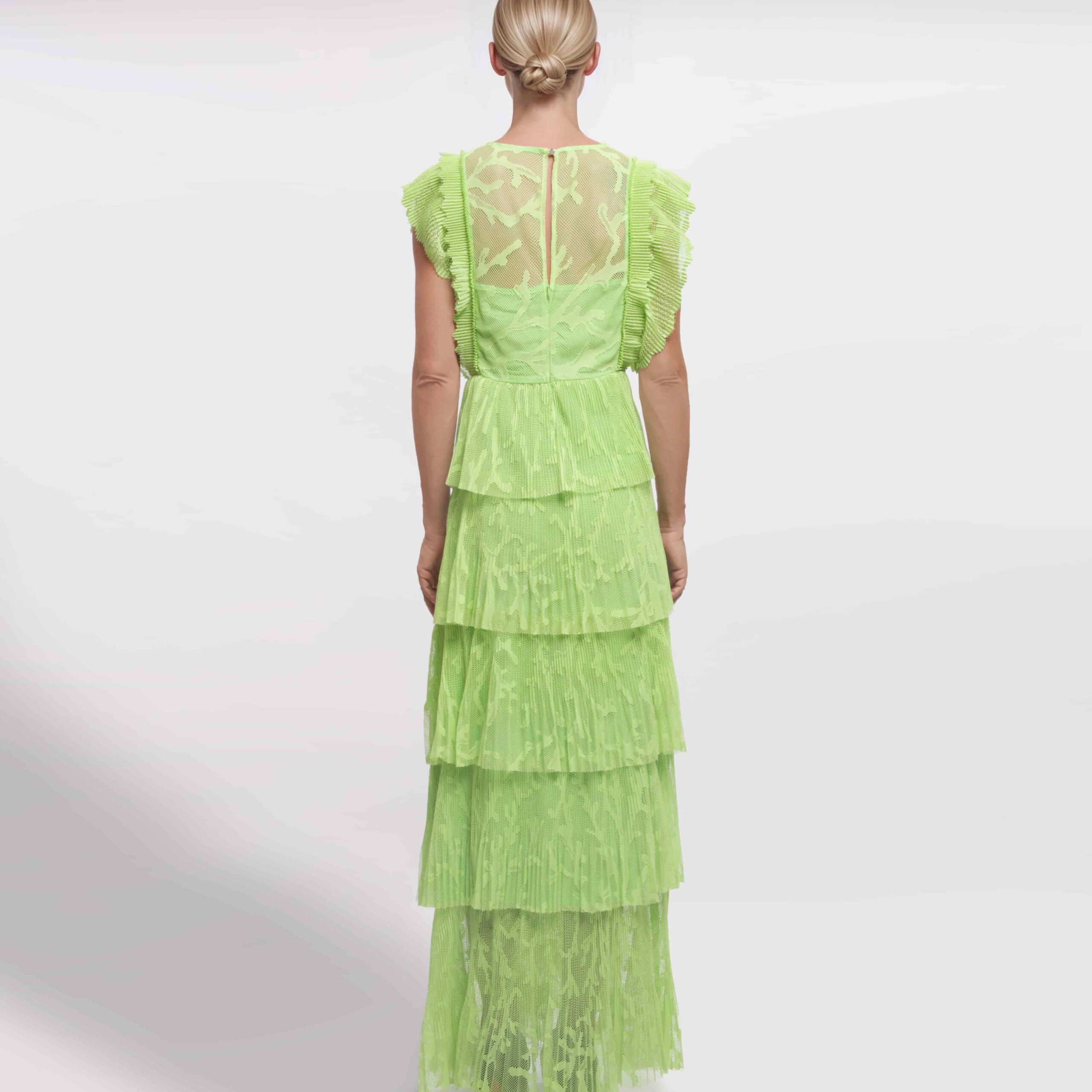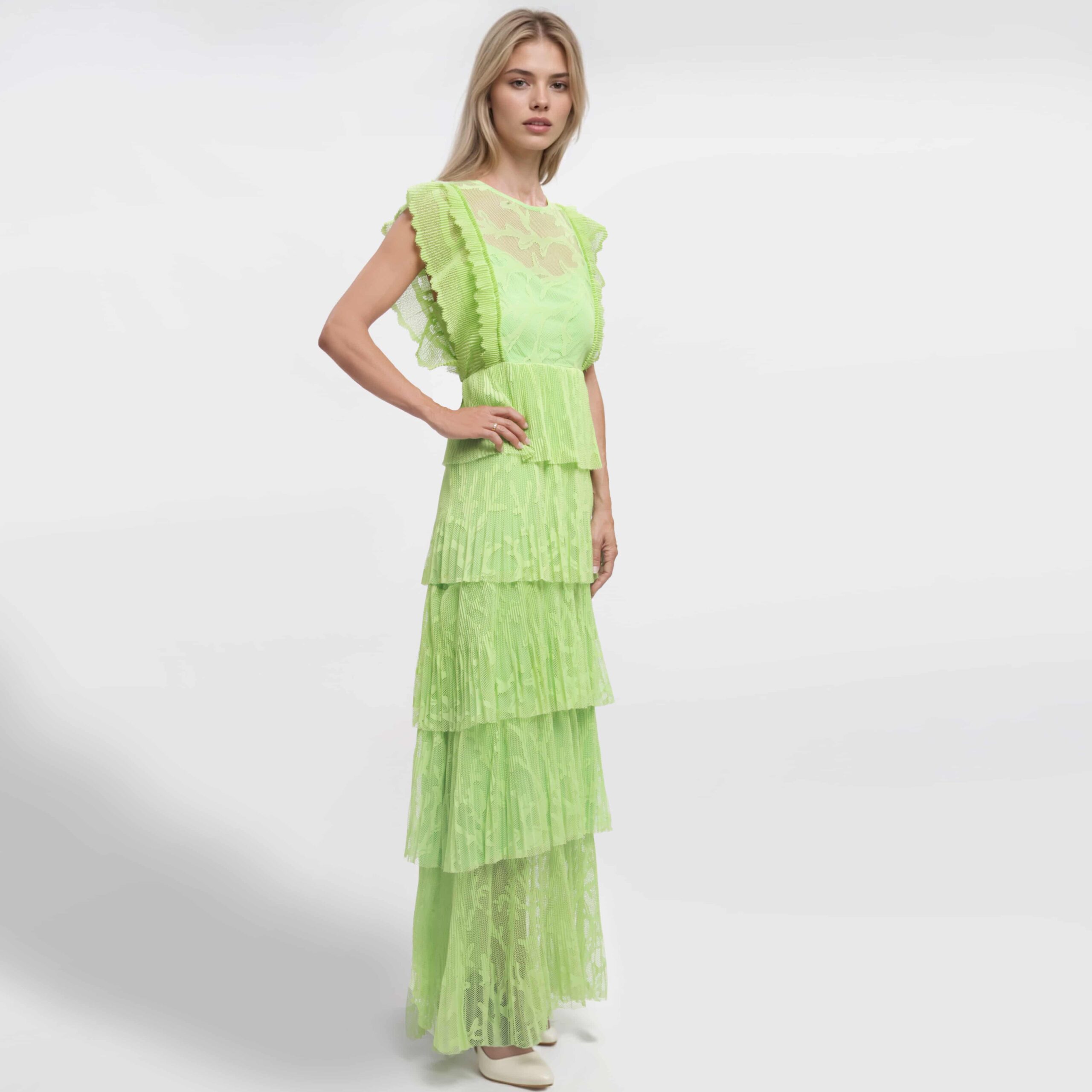 BEATRICE B. – Abito Lungo Verde Lime in Pizzo e Plissé a Balze