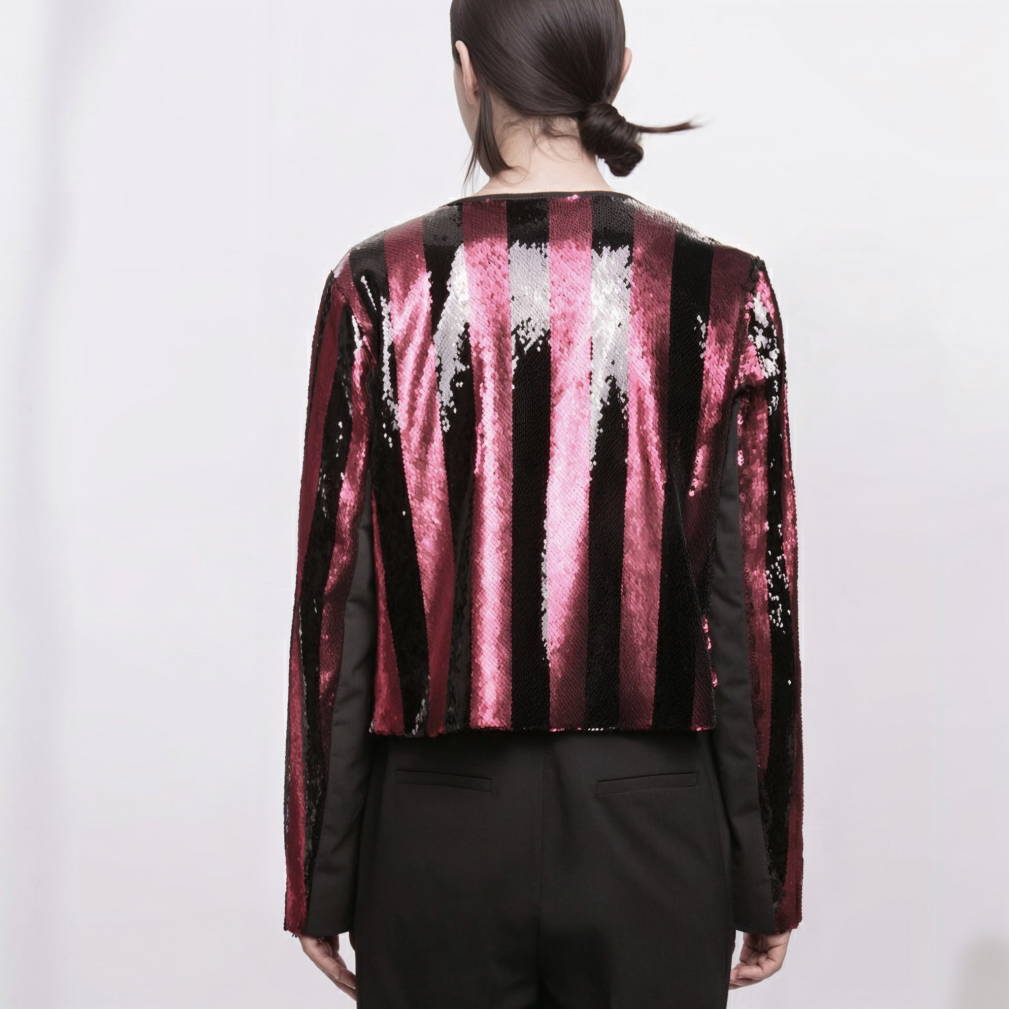Il giacchino donna Beatrice B è un capo esclusivo che unisce eleganza e originalità grazie alla sua ricercata lavorazione in paillettes multicolor. I riflessi rosa, rossi e neri creano un effetto luminoso e sofisticato, perfetto per occasioni speciali, eventi, cerimonie o look serali di grande impatto visivo.