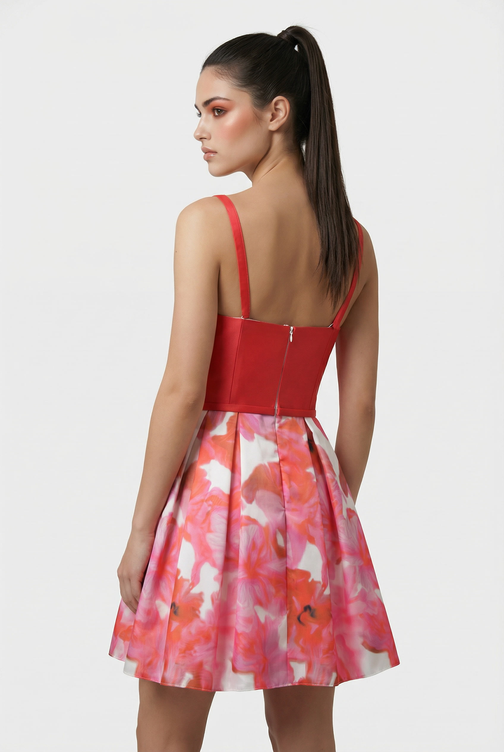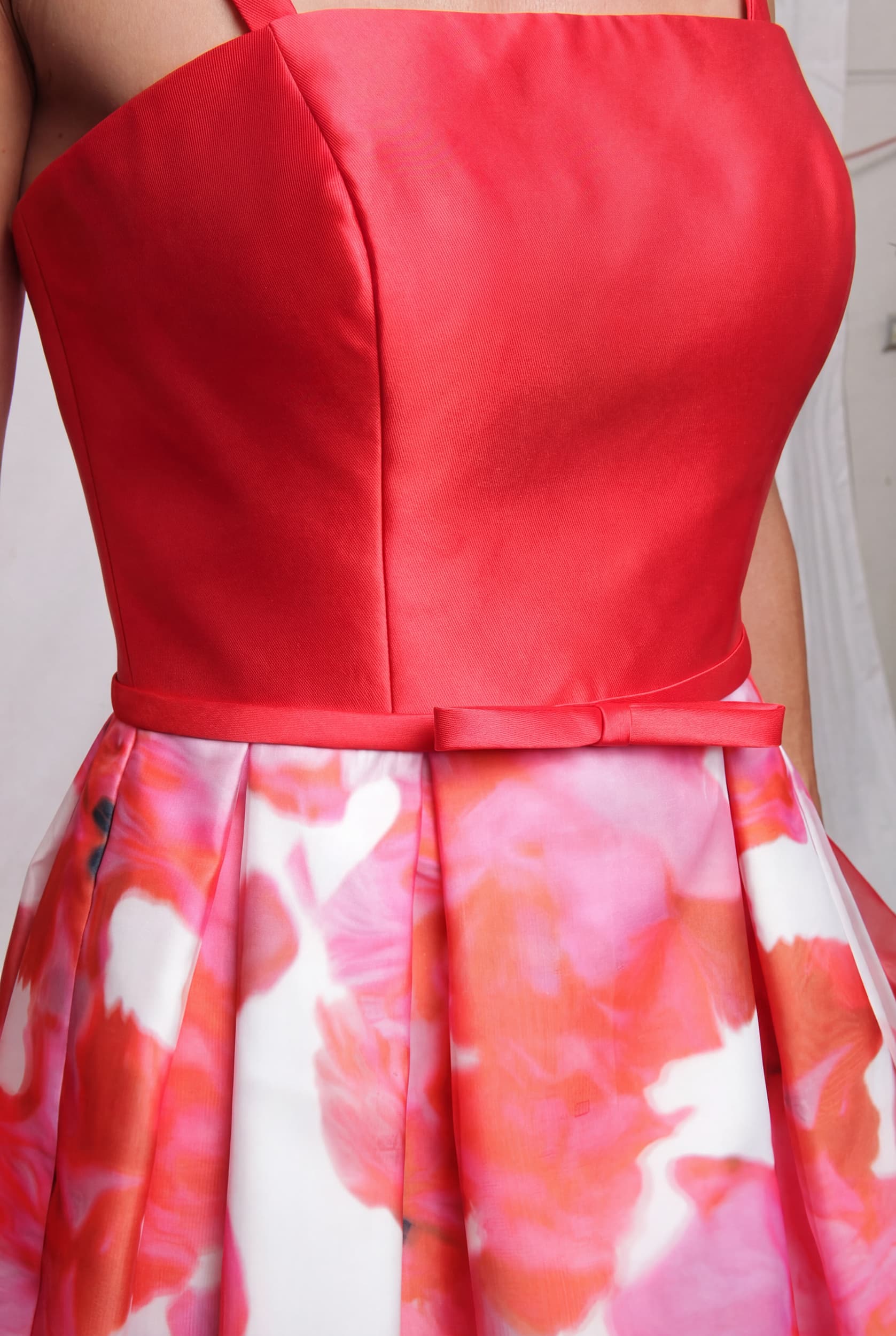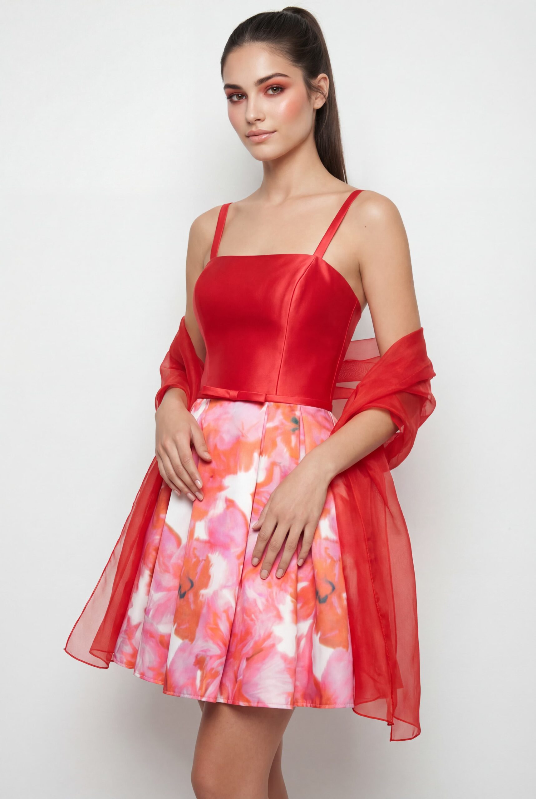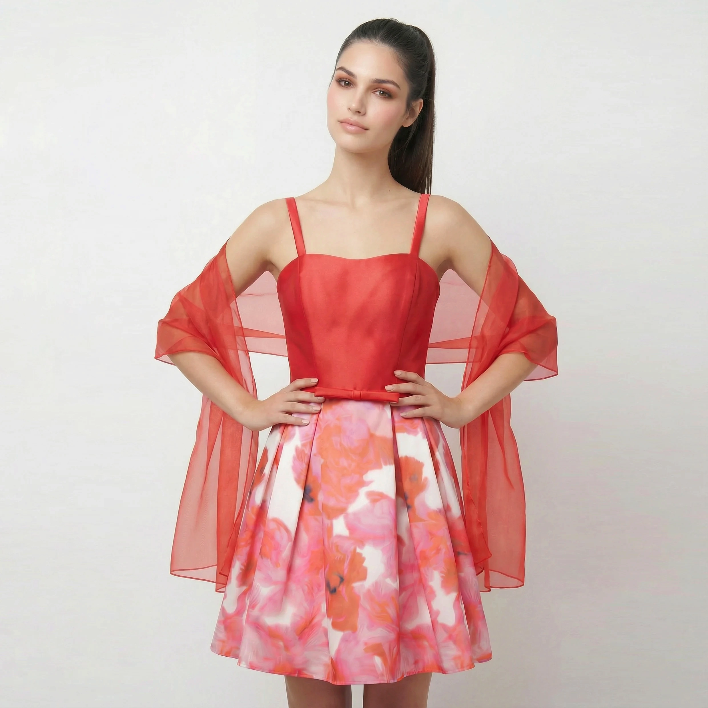 Il Bianca Brandi Abito Cerimonia è l’essenza della freschezza e dell’eleganza per i tuoi eventi speciali. Caratterizzato da un vivace color corallo, questo modello combina un corpetto a fascia strutturato con una romantica gonna a palloncino. Il dettaglio distintivo è il tessuto leggero e trasparente sovrapposto alla gonna floreale, che richiama la stola coordinata inclusa, regalando un movimento etereo e sofisticato.
