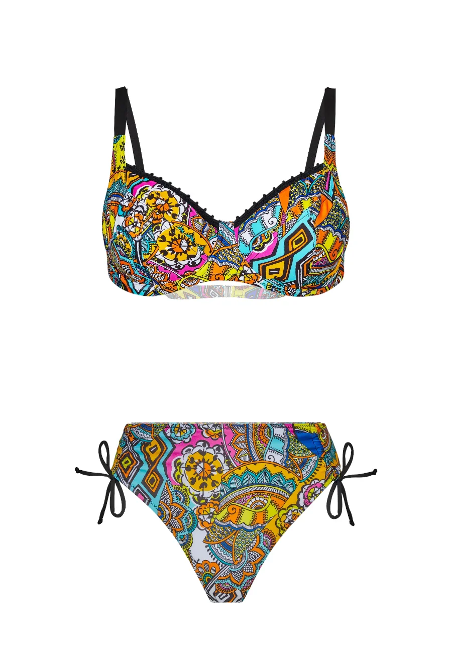 Bikini composto da balconcino morbido con ferretto e spalline regolabili dritte o incrociate. Slip alto con fianchi regolabili.