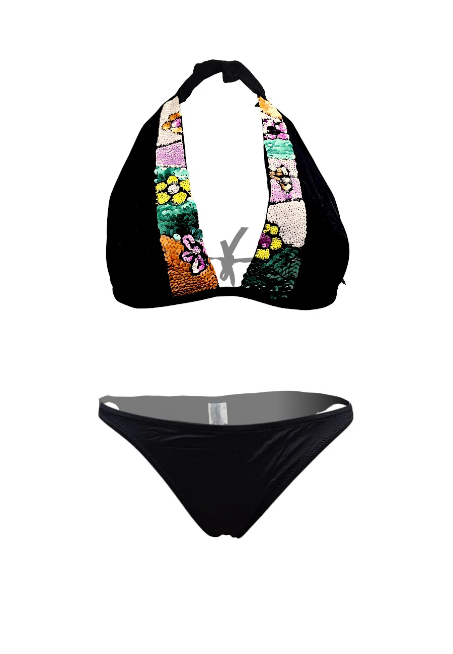 Bikini Blumarine composto da triangolo a vela ricamato a mano con coloratissime paillettes e slip coordinato con strass sul retro. Capo pregiato.
