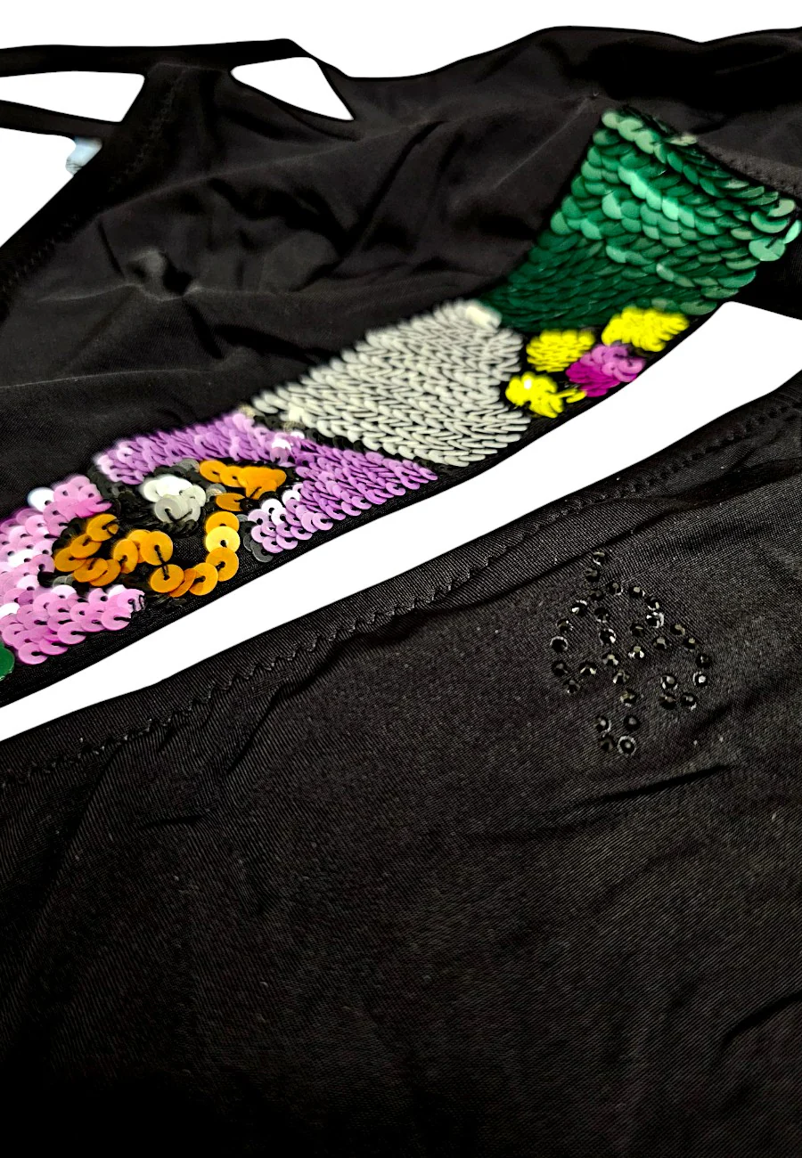 Bikini Blumarine composto da triangolo a vela ricamato a mano con coloratissime paillettes e slip coordinato con strass sul retro. Capo pregiato. Made in Italy 90% poliammide 10% elastan
