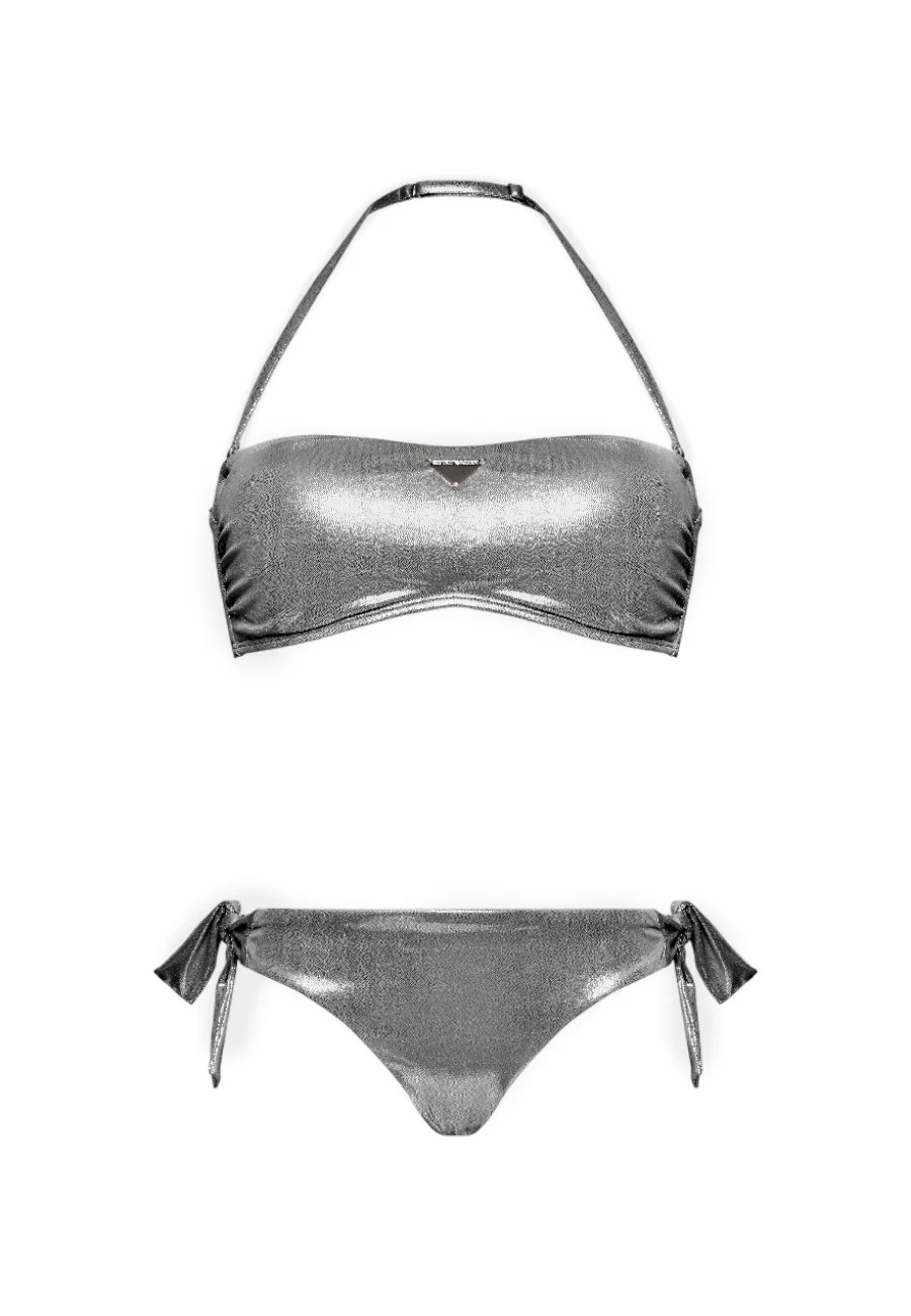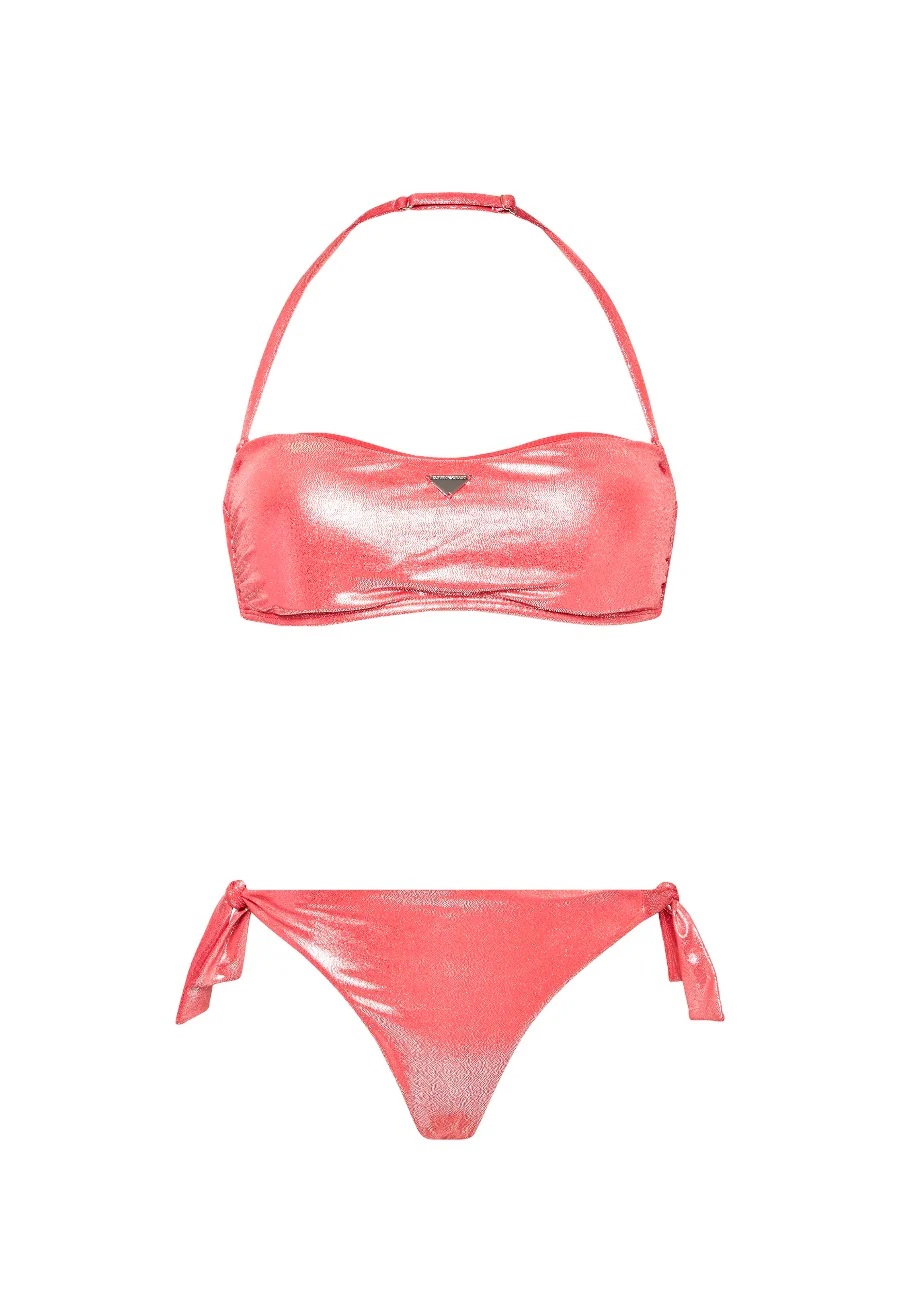 Costume bikini composto da reggiseno a fascia con coppe removibili abbinato a slip modello brasiliana con fiocchi laterali. Realizzato in tessuto con spalmatura argentata. Placchetta logata in metallo.
