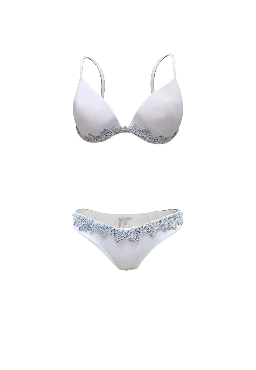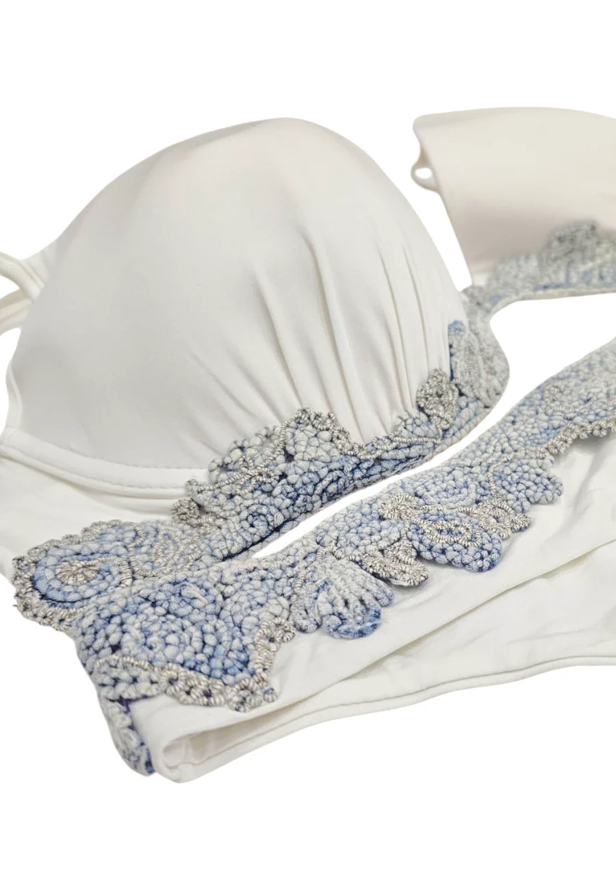 Coppa C Pregiato bikini made in Italy by Ermanno Scervino composto da push up e slip fondo bianco con ricami artigianali effetto denim delavè Made in Italy 85%nylon 15% elastan