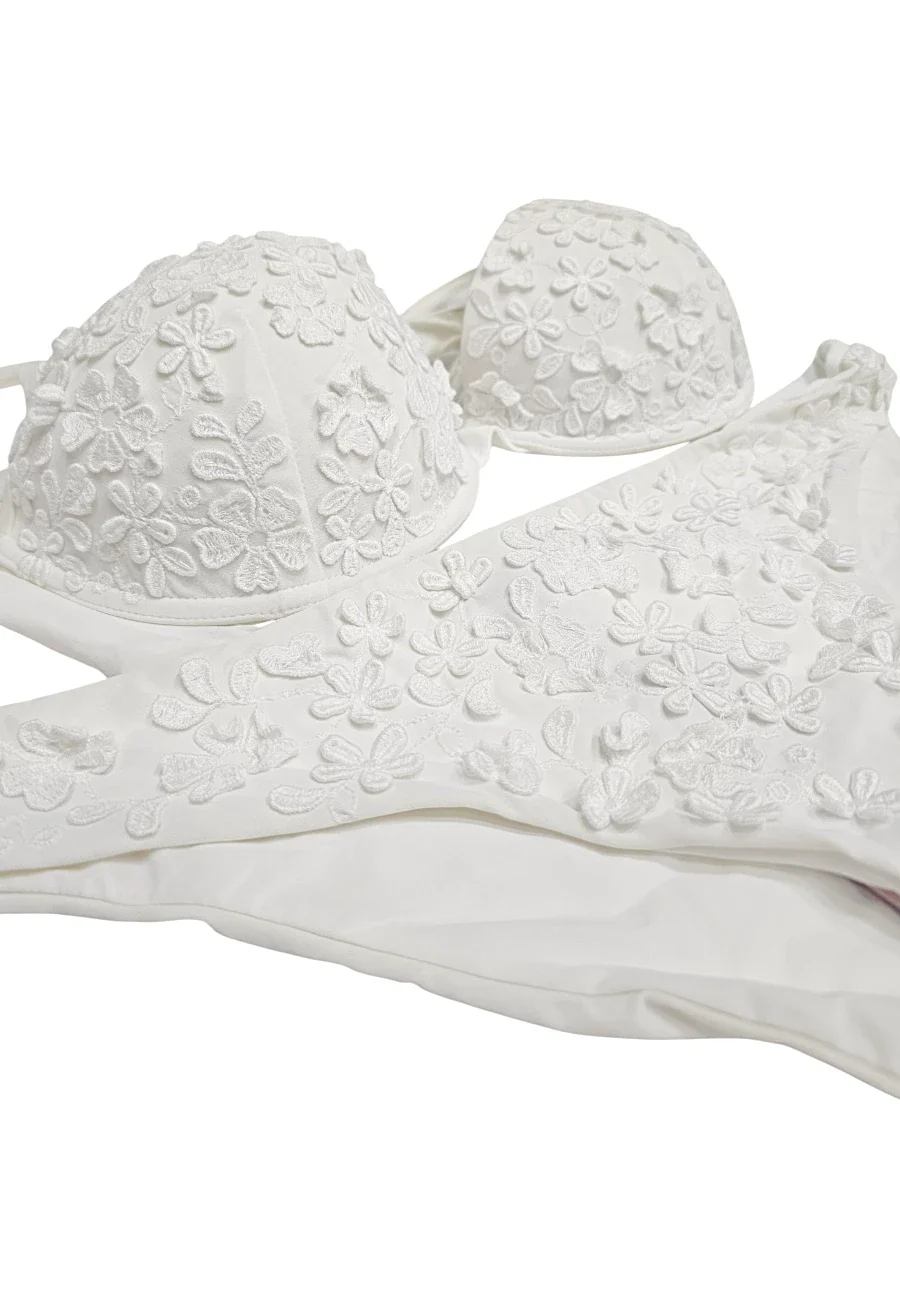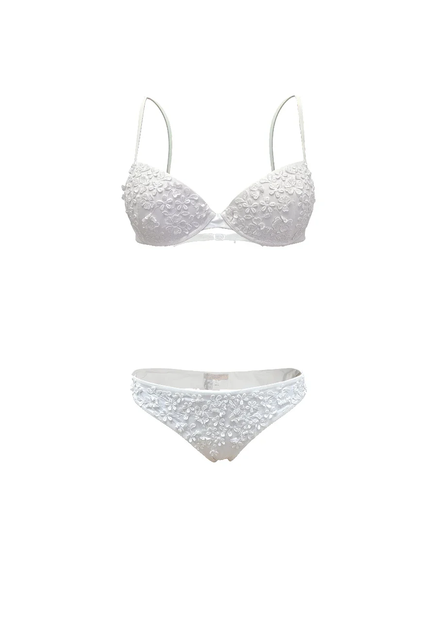 Pregiato bikini made in Italy by Ermanno Scervino composto da push up e slip entrambi impreziositi da ricami di fiorellini in tinta