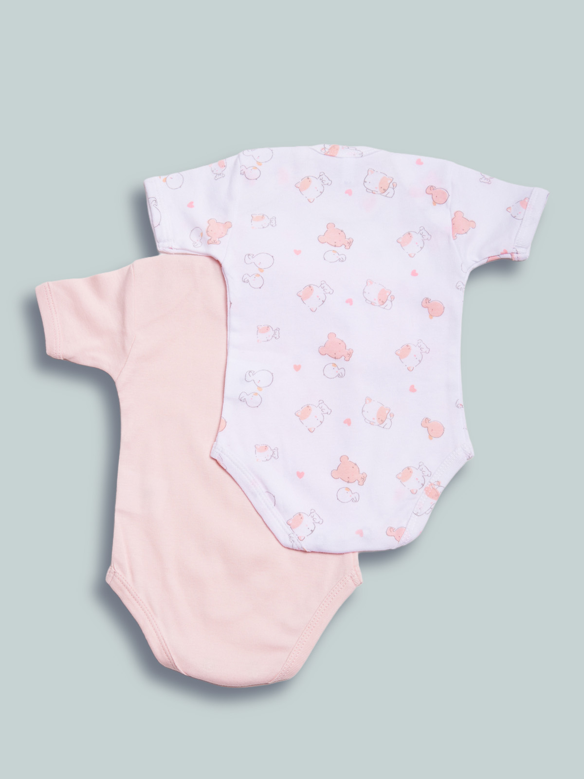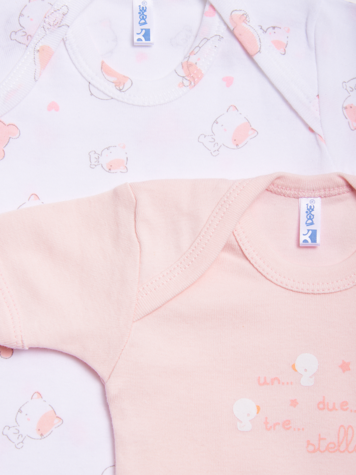 Set composto da due body in costina di cotone con scollo all’americana. Apertura al cavallo con pratici bottoncini a pressione. La confezione comprende due body uno tinta unita con grafica, il secondo fantasia sui toni del rosa.