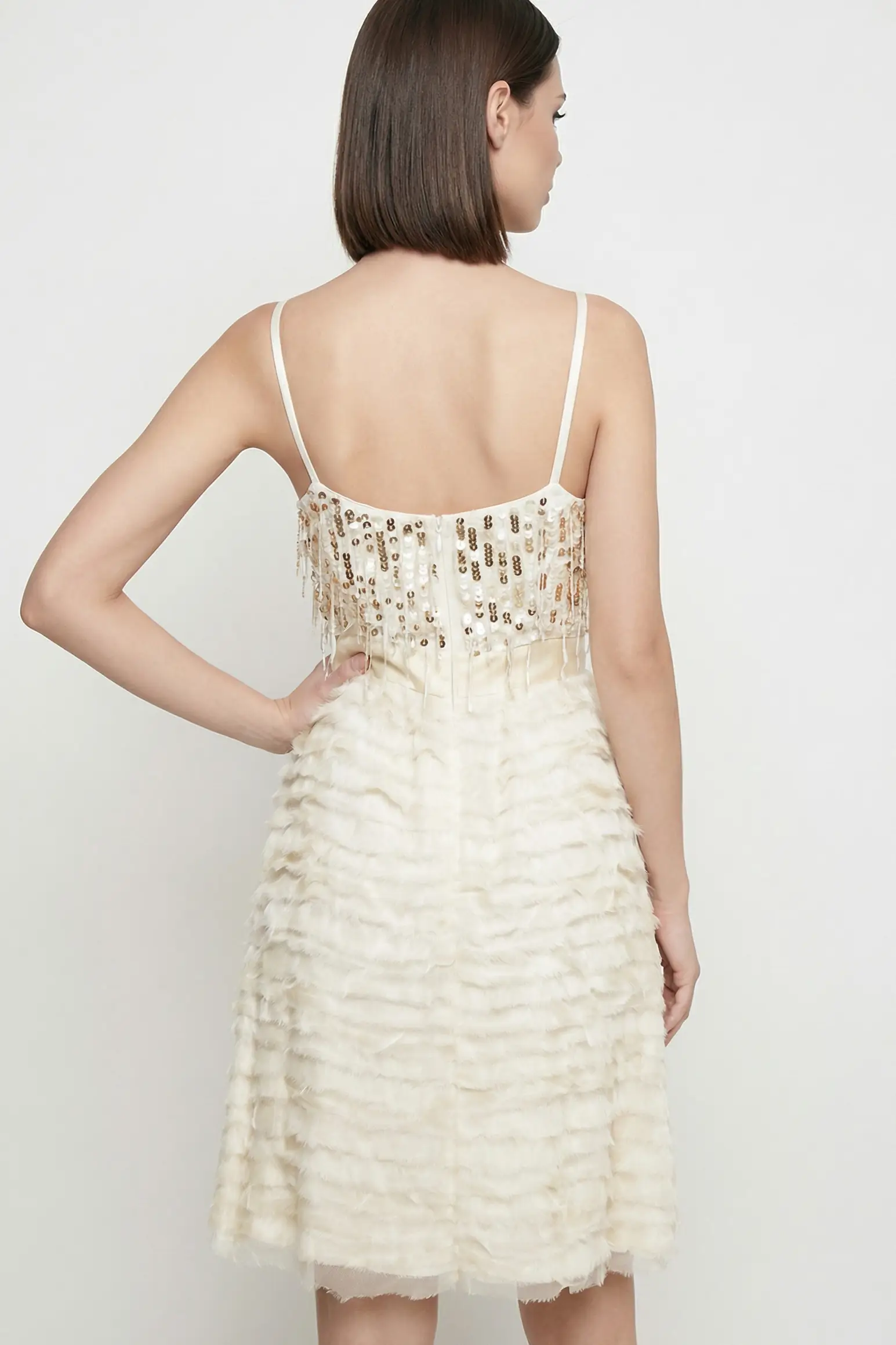 L’abito da cerimonia BLUGIRL by BLUMARINE è un vero gioiello di sartoria, perfetto per eventi formali, cocktail party o matrimoni. La struttura del capo è realizzata al 100% in pregiata viscosa, un materiale che garantisce una caduta fluida e una lucentezza naturale. Il colore avorio, tenue e sofisticato, funge da base perfetta per le ricche applicazioni metalliche che decorano la parte superiore dell’abito da cerimonia BLUGIRL by BLUMARINE.