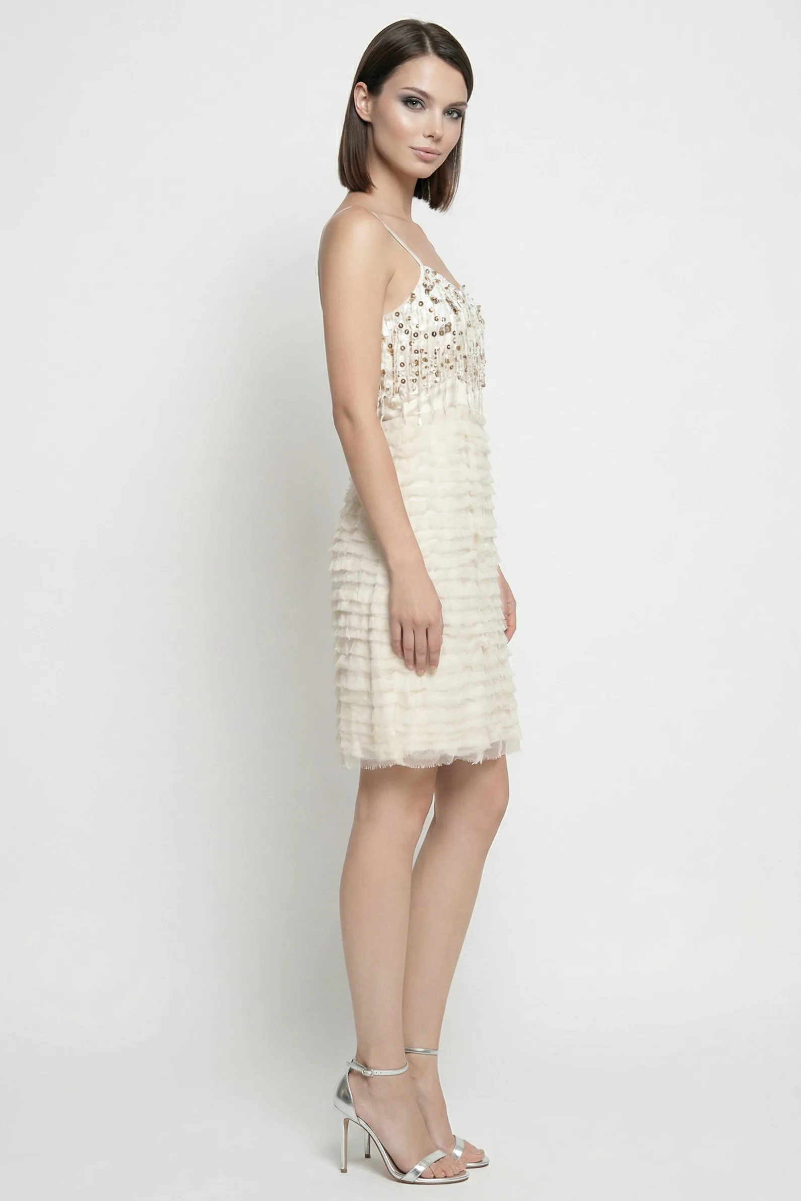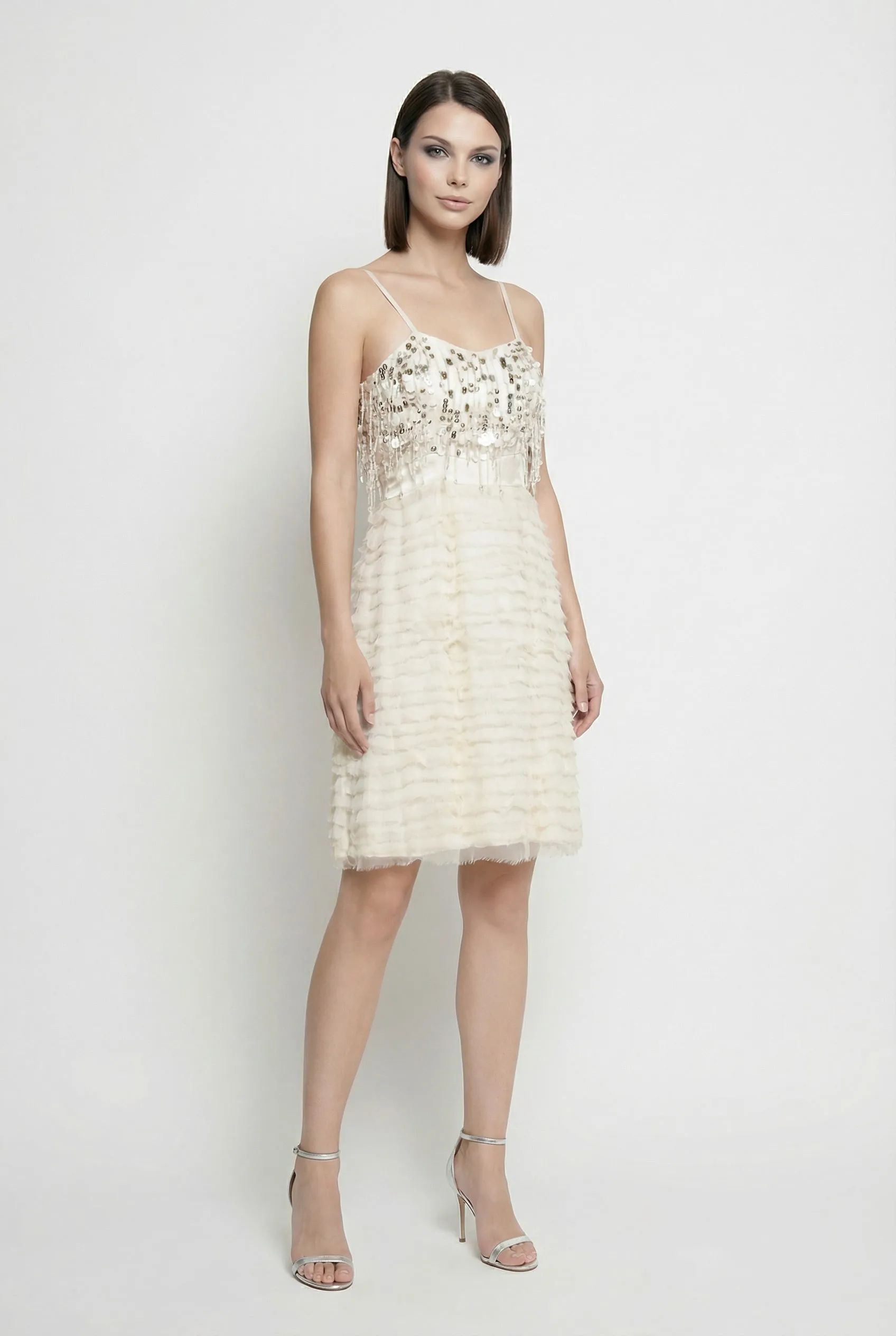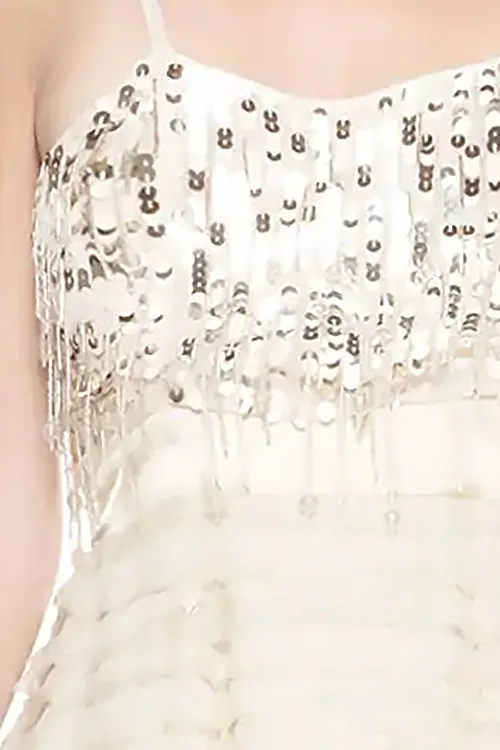 Esalta la tua eleganza con l’abito da cerimonia BLUGIRL by BLUMARINE in una raffinata tonalità avorio. Questo esclusivo modello smanicato si distingue per il corpetto ricamato a mano con strass e paillettes luminose e una gonna a balze orizzontali in viscosa, offrendo una vestibilità impeccabile per la taglia IT 42 (M).