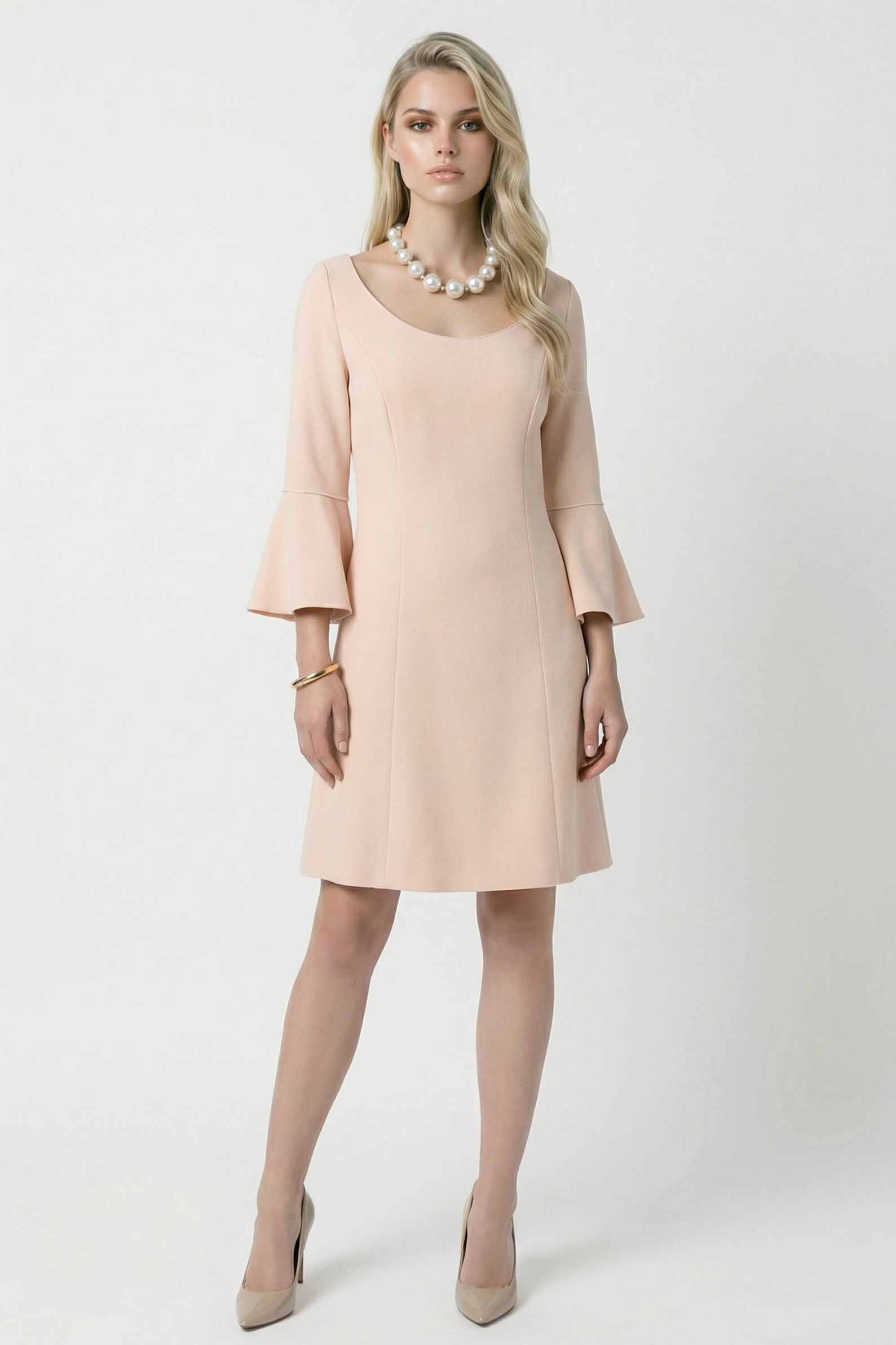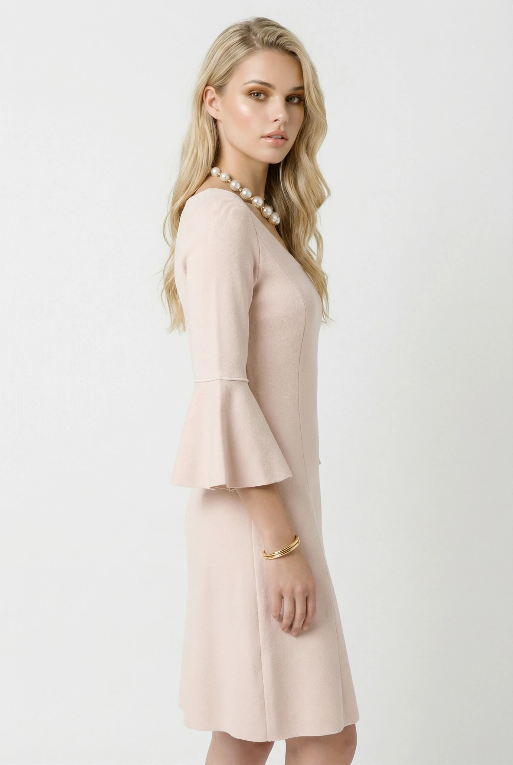 Abito corto Blumarine in viscosa rosa cipria, con maniche a campana e linea svasata. Elegante e raffinato, ideale per cerimonie e look speciali.