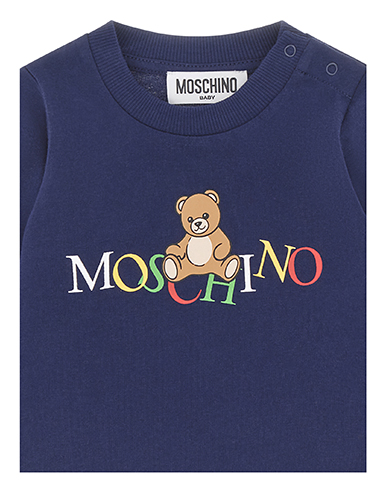 Blusa blu del brand Moschino Kids, realizzata in cotone felpato, con maniche lunghe, girocollo, si chiude con bottoni automatici sulla spalla. ร decorata con stampa Teddy Bear e logo, sulla parte anteriore.