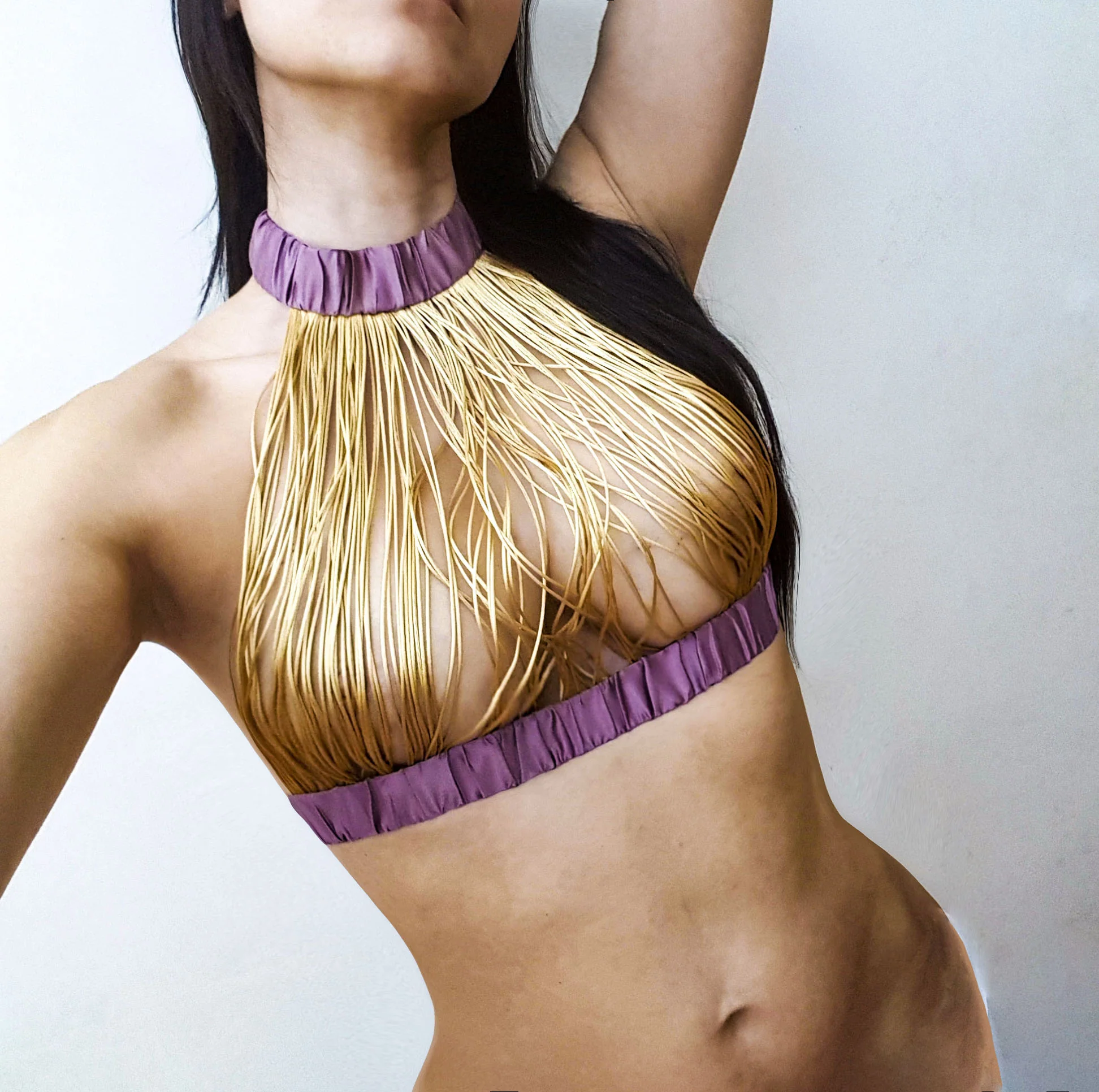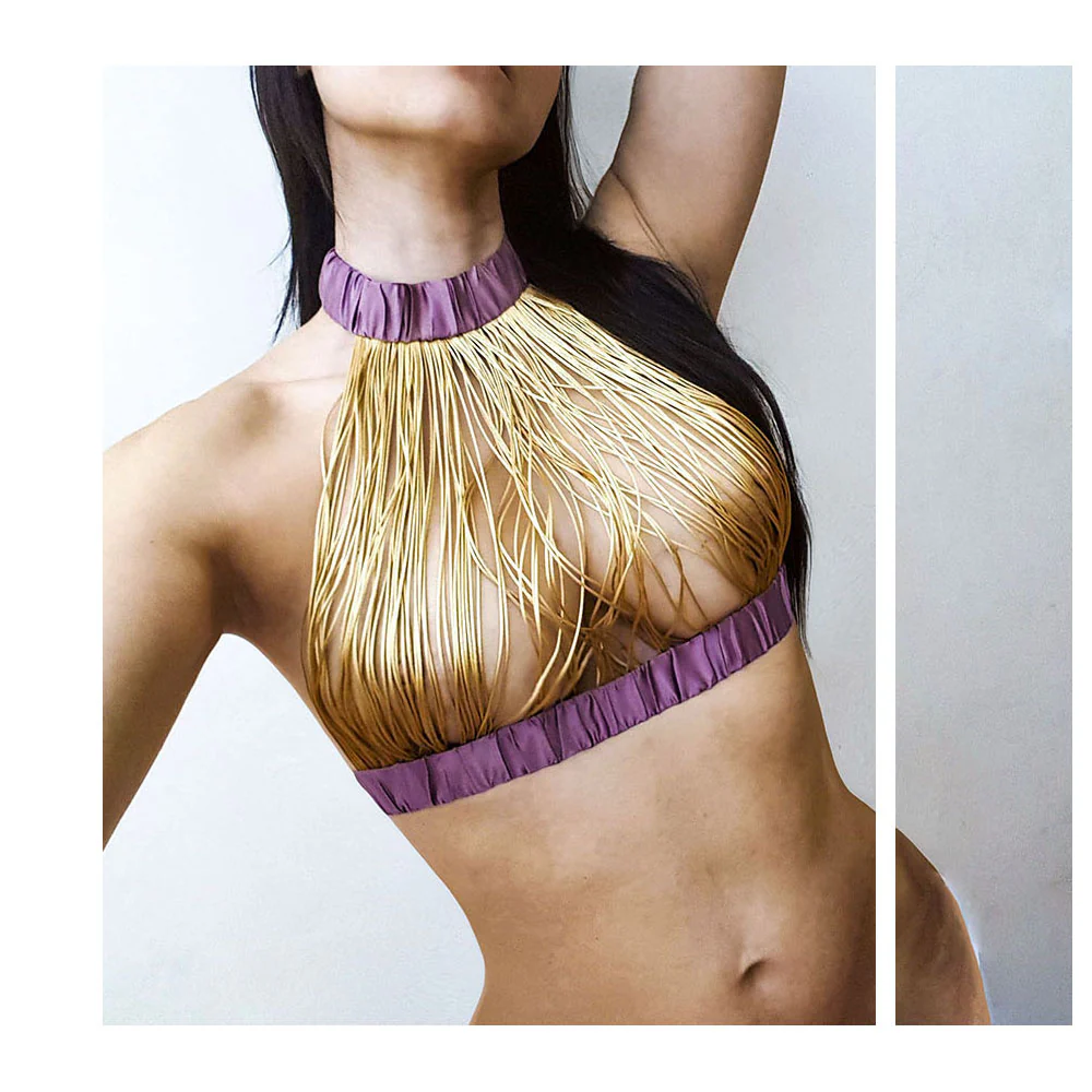 top budoir satin firmato MECEDORA. In questo pezzo abbiamo la massima espressione del sensuale gioco di vuoti e pieni che rende uniche le collection Mecedora Lingerie. Inatteso binomio di colori che sfrutta la lucentezza del satin per liberare tutte le sfumature che nascono dal motivo a drappeggio e dalle frange in raso tubolare golden.